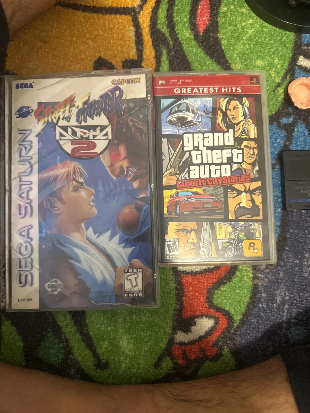 Selling a few video games and memory cards. Includes Street Fighter Alpha 2 for Sega Saturn, Grand Theft Auto Liberty City Stories for PSP, a Sony Playstation 2 8MB memory card, and a Neo Geo Pocket Color memory card