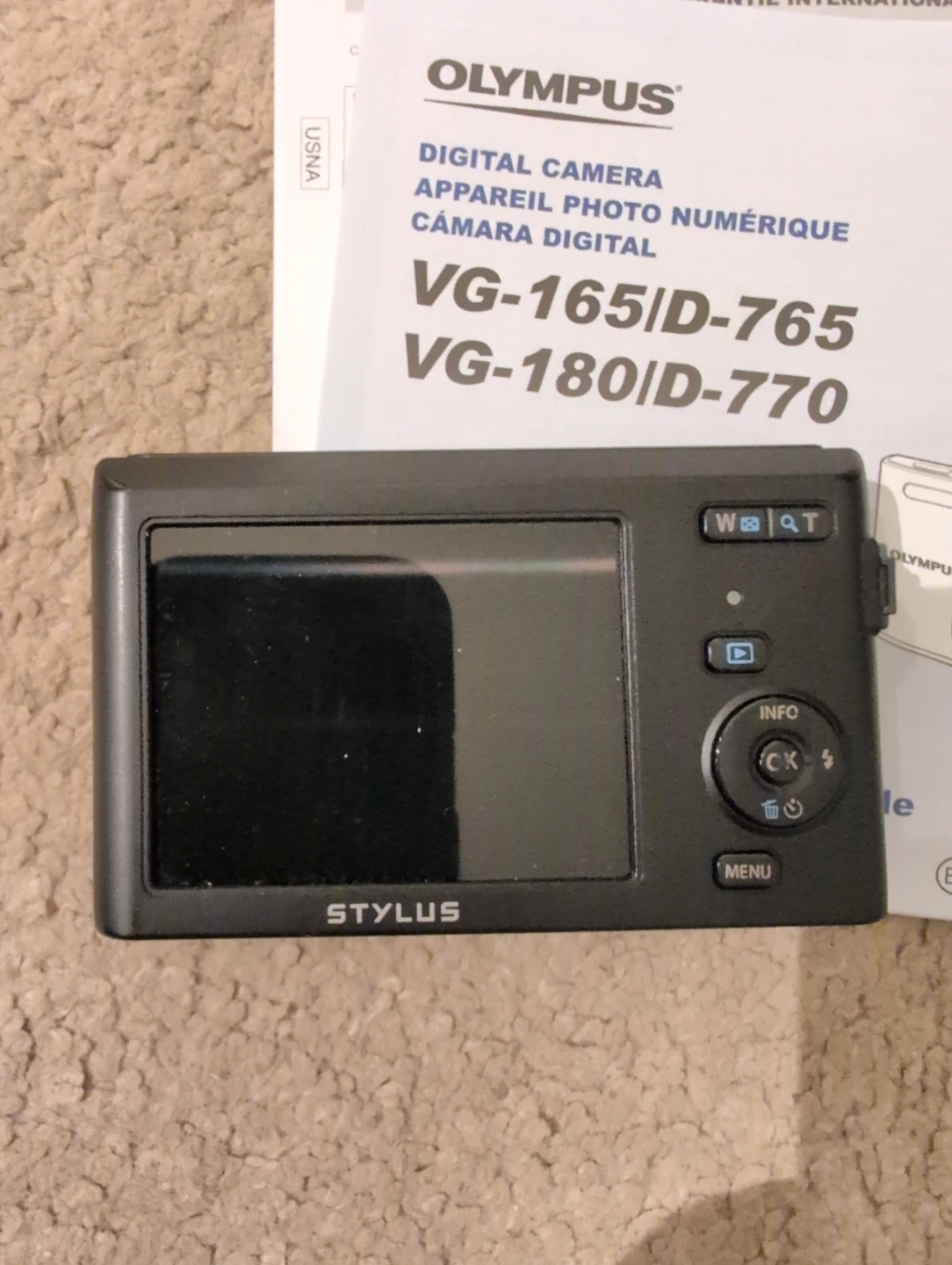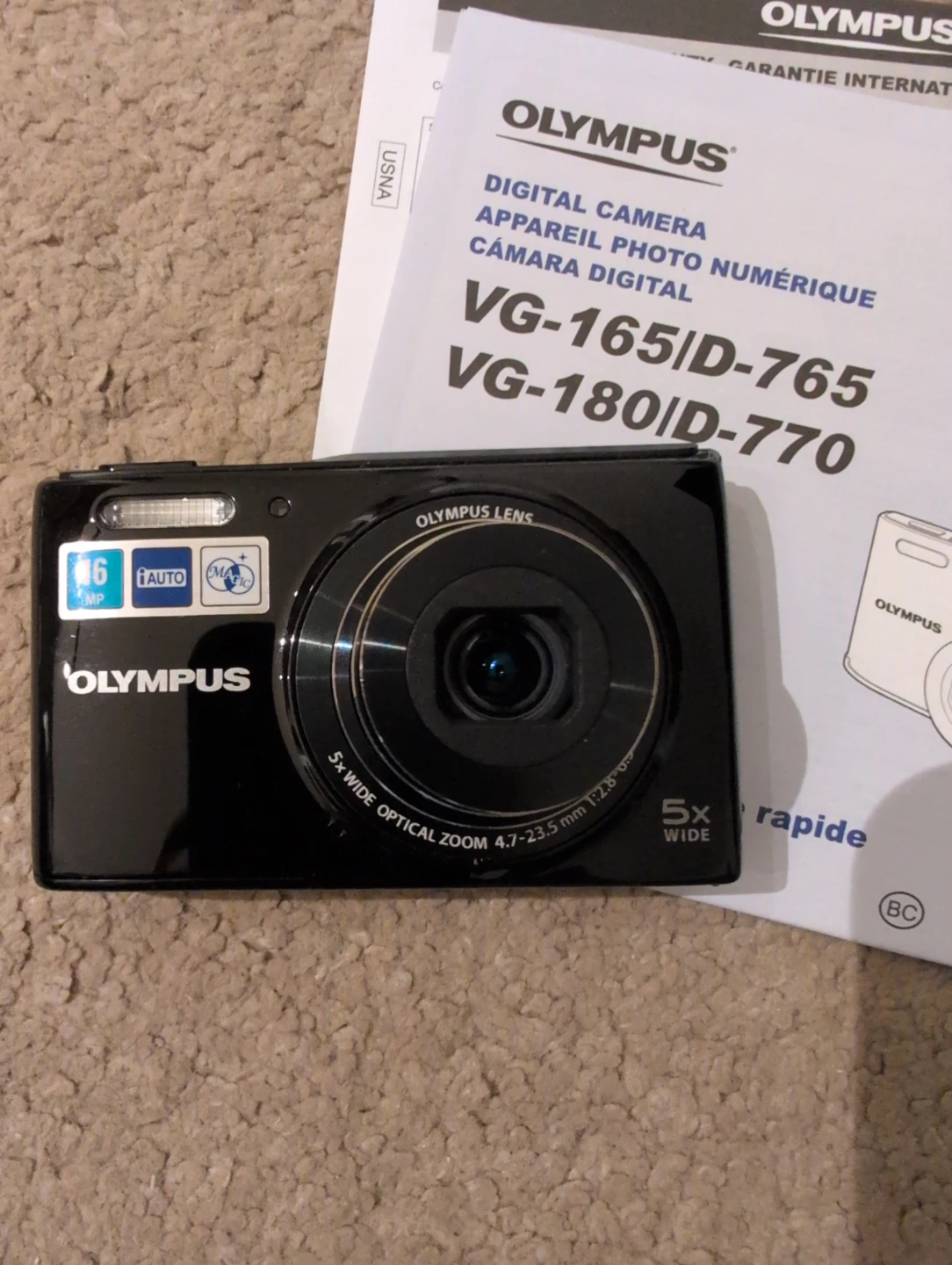 Selling an Olympus digital camera, model VG-180/D-770. 16 MP. It also includes the manuals and charger (not pictured). It has an Olympus lens with 5x wide optical zoom.