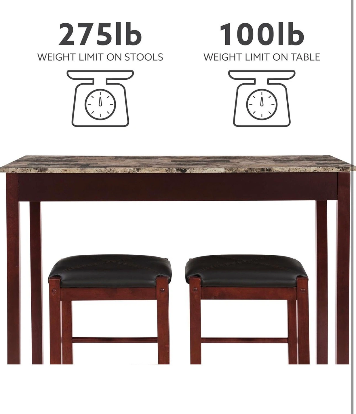 Dimensions: Table – 42.25” W x 22.13” D x 36.25” H | Stool (each) – 13.75” W x 13.75” D x 25” H | Table Weight Capacity – 200 lbs. | Stool weight capacity (each) – 275 lbs.