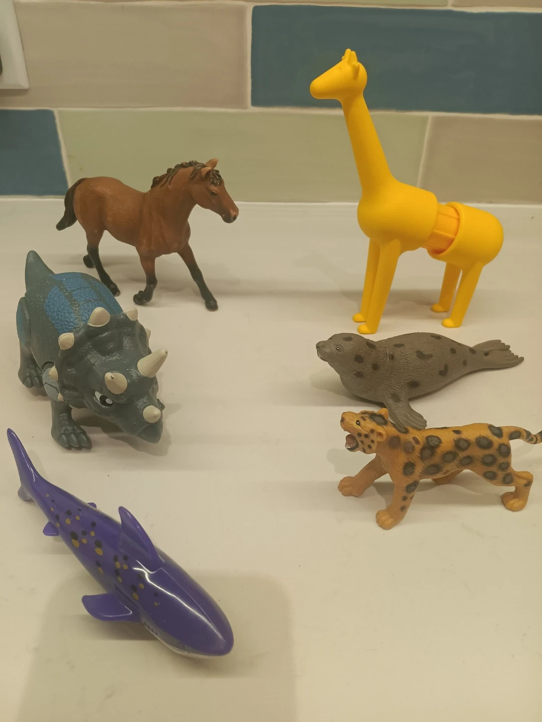 Selling a collection of animal figure toys! Includes a horse, seal, shark, giraffe, dinosaur, and jaguar. Great for kids or collectors!