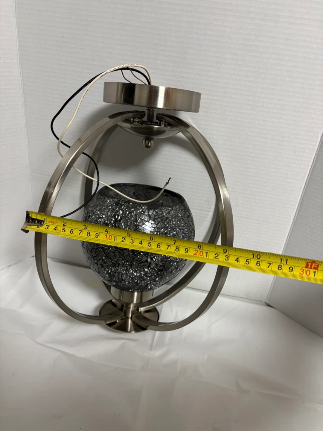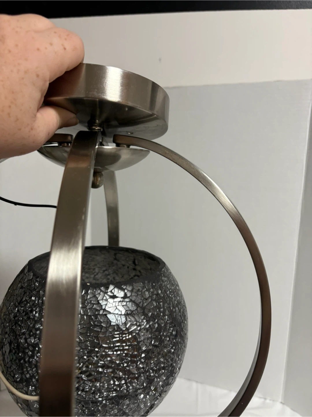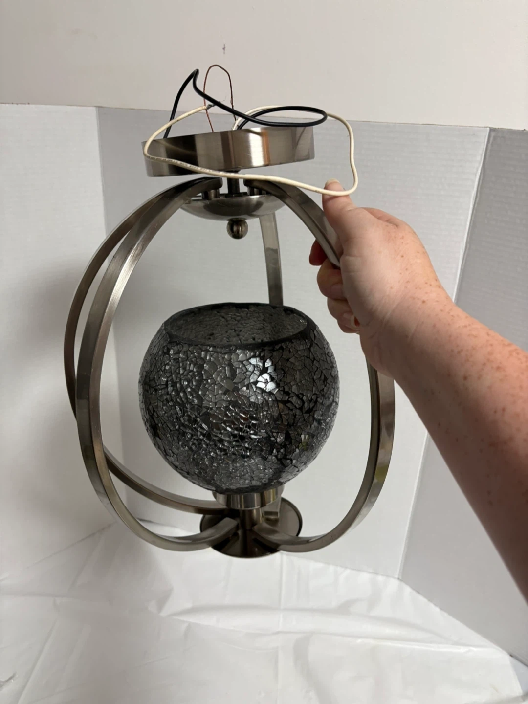 Selling a pendant light with a mosaic glass globe. The metal frame has a brushed nickel finish. There are some minor scratches on the metal, as shown in the pictures. It would be a lovely addition to any room!