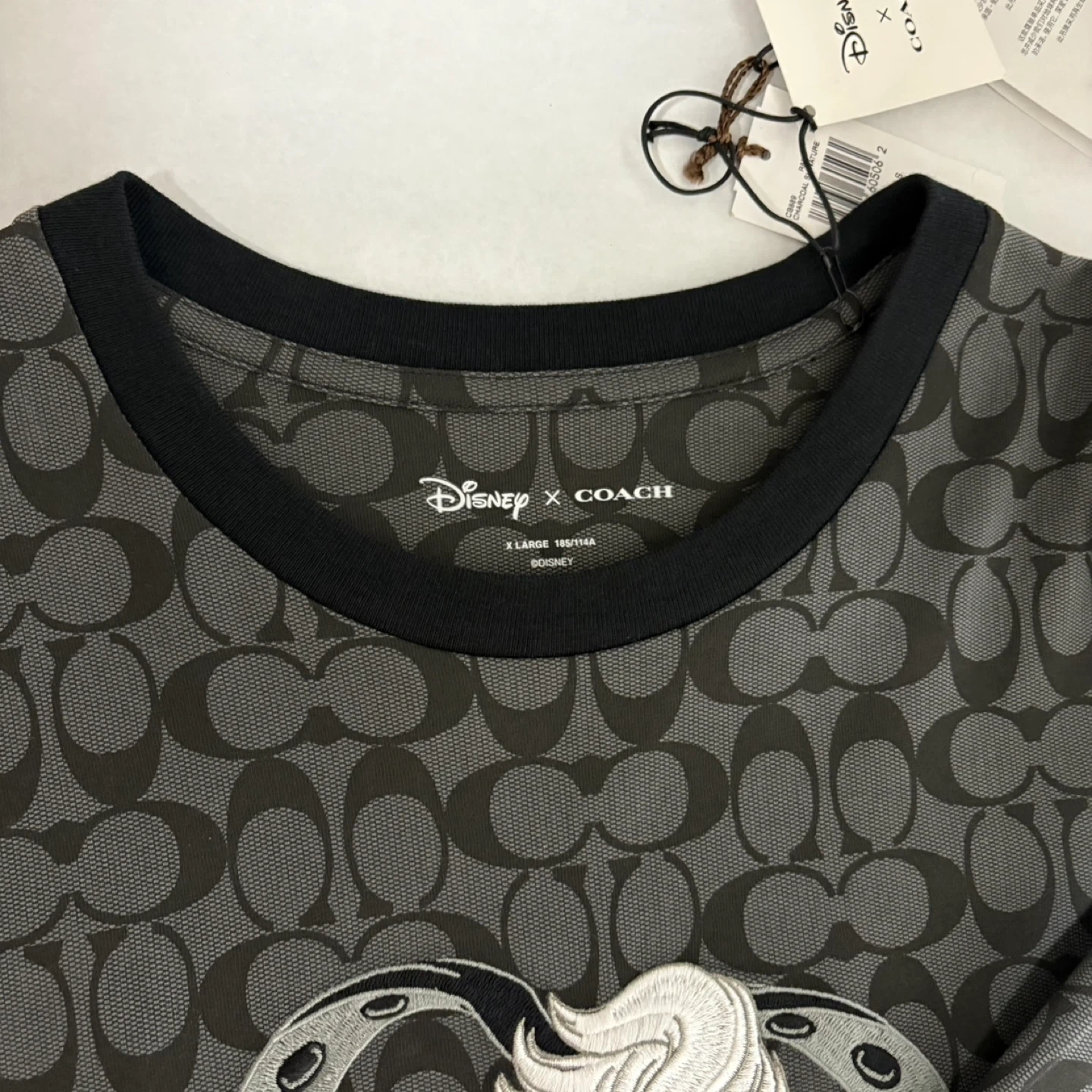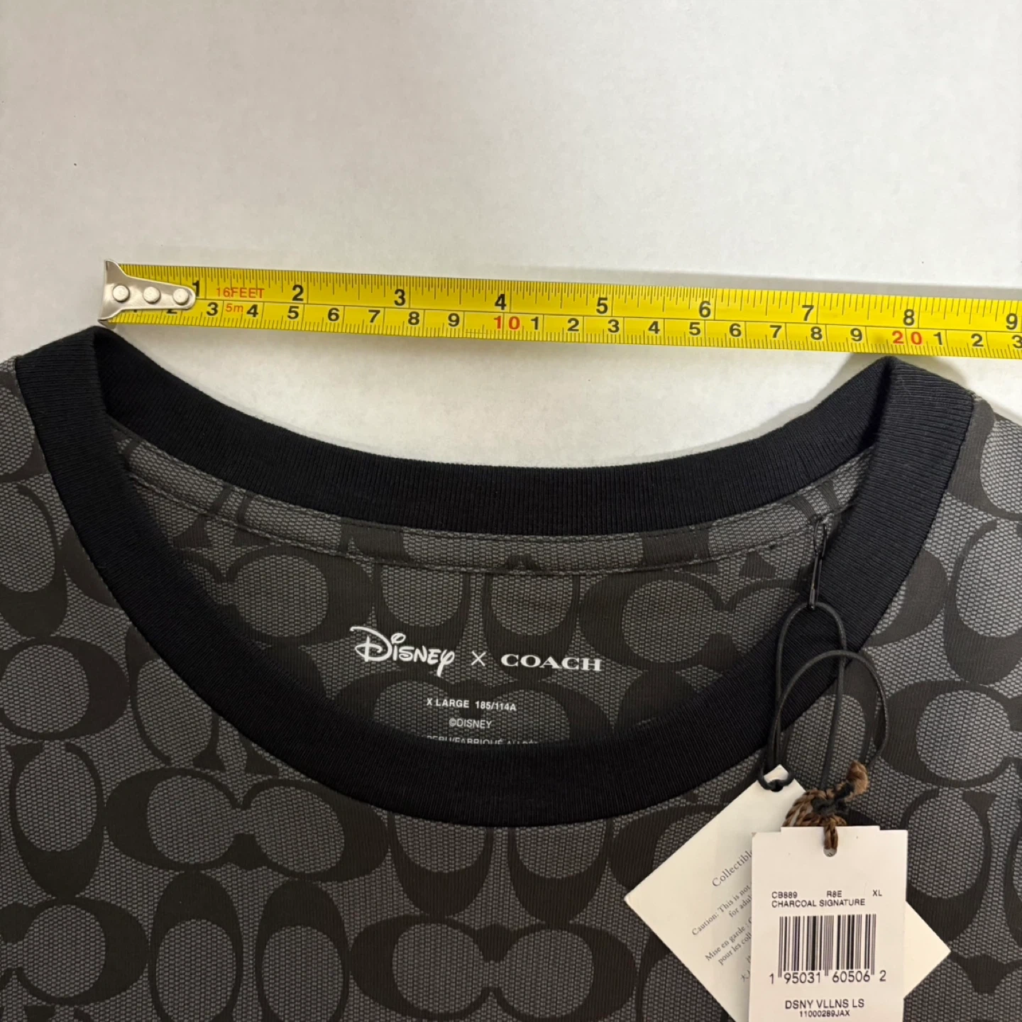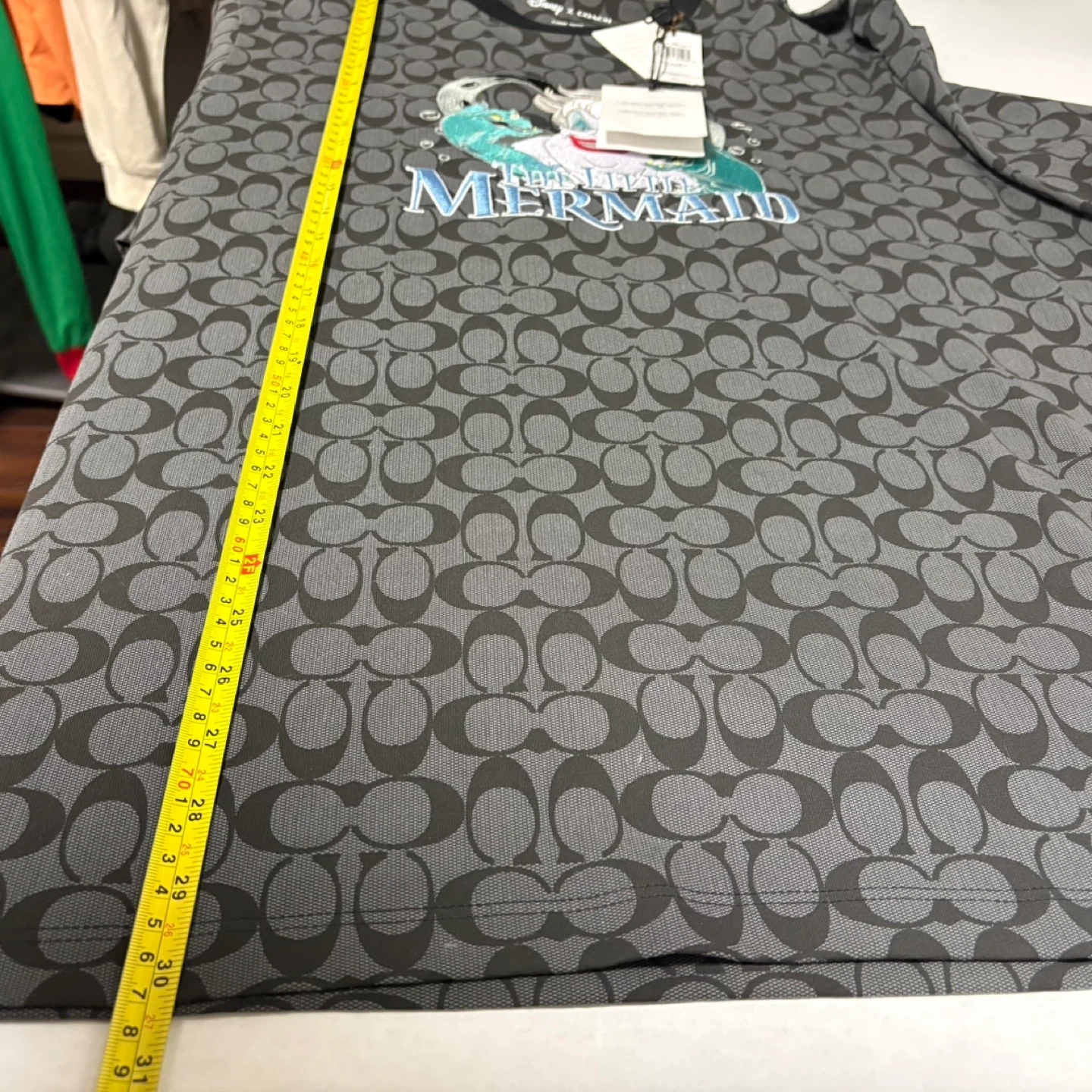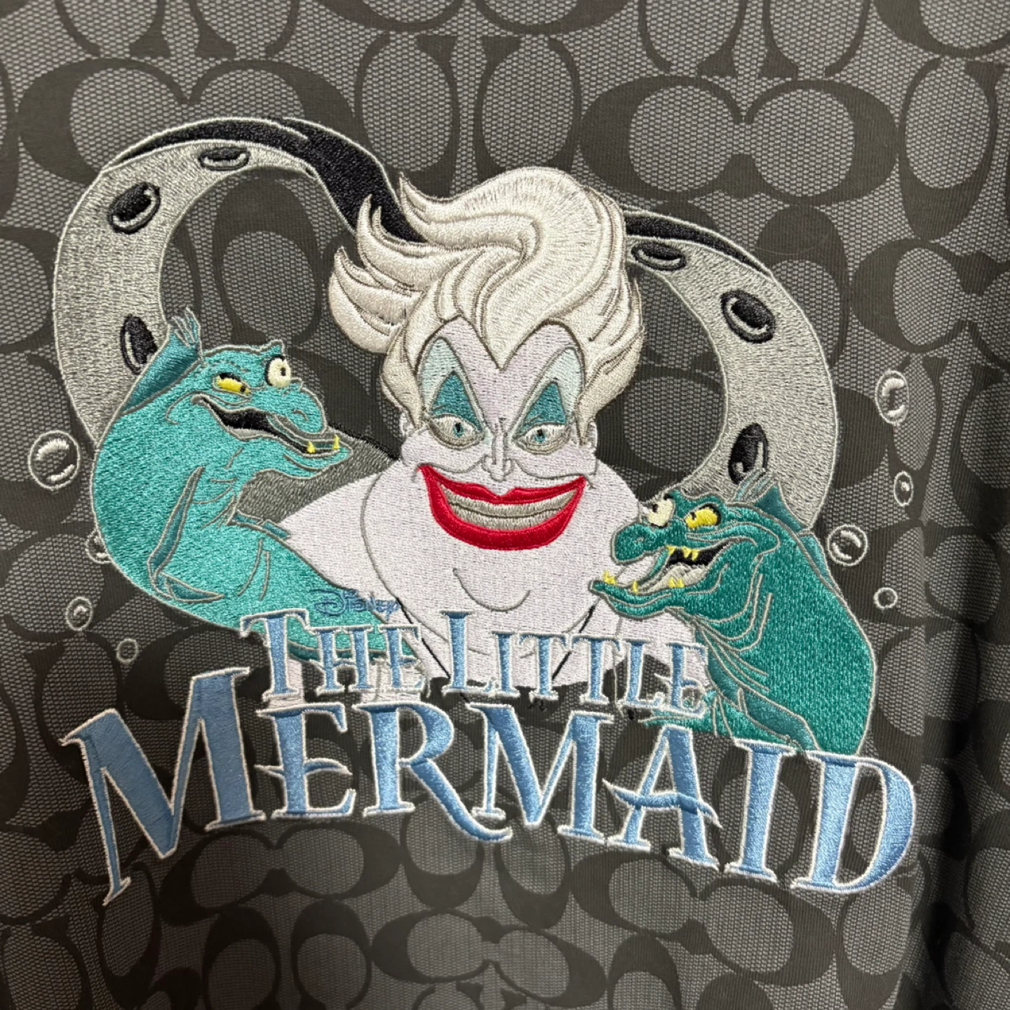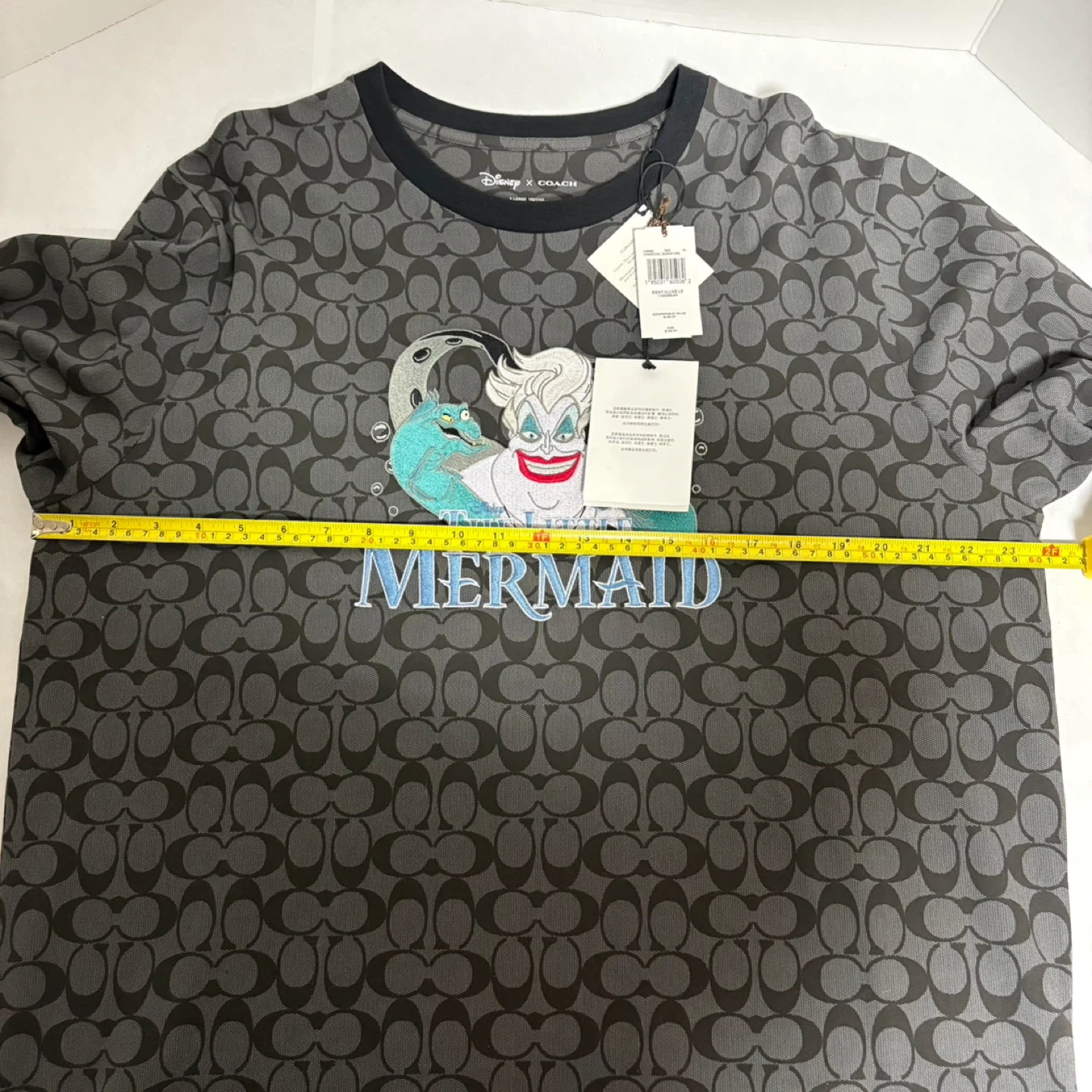 This is a Disney x Coach long-sleeve shirt featuring Ursula from The Little Mermaid. It's a size XL and has a charcoal signature pattern. The shirt is crafted in organic cotton. The comparable value is $198 CAD