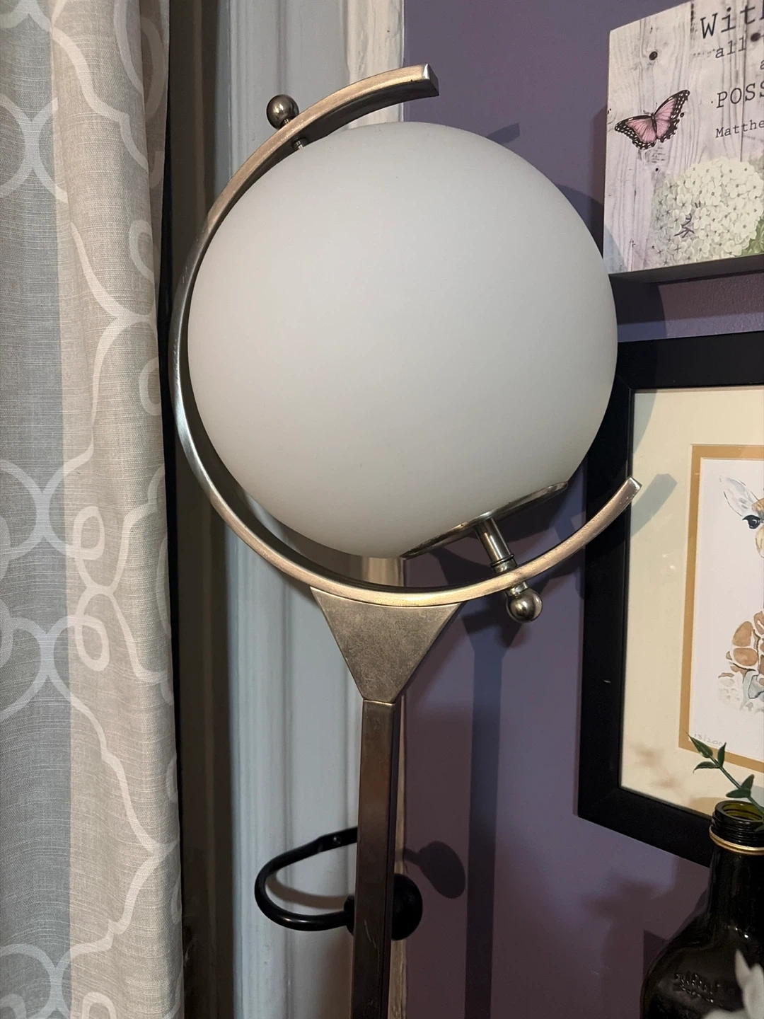 Selling a globe floor lamp. It has a sleek design and provides a soft, ambient light. Perfect for any room! Dimmable too with a slider switch