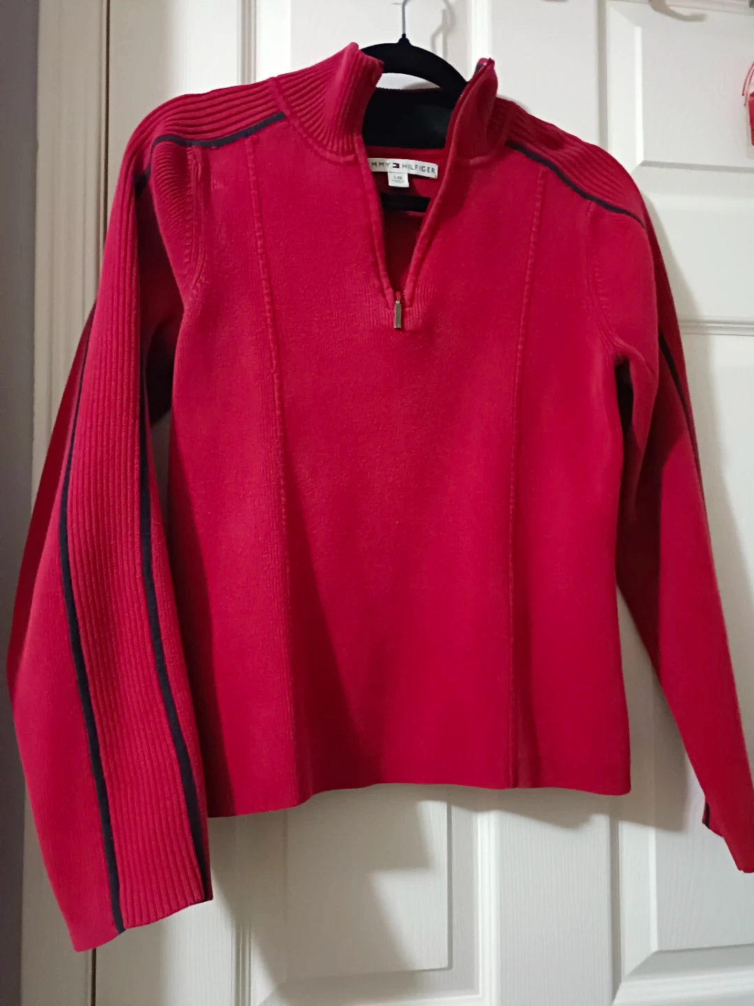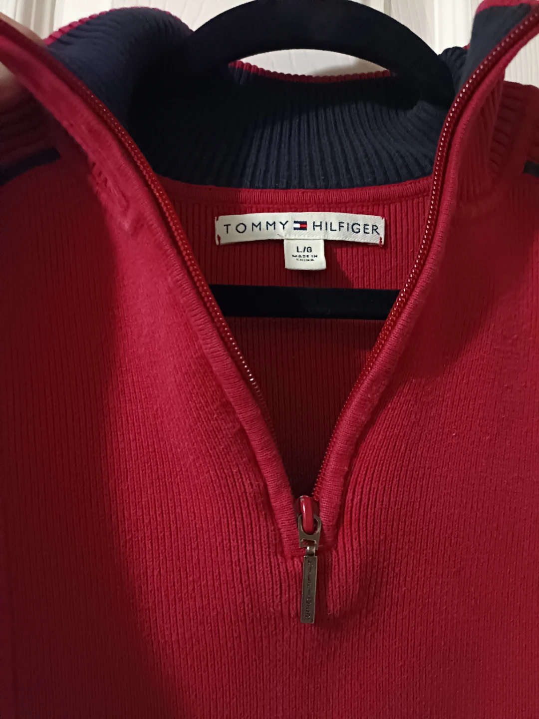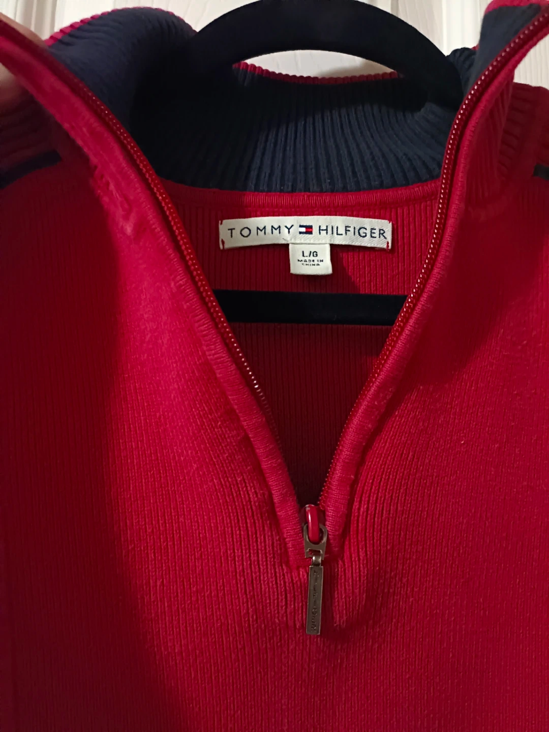 Cozy Tommy Hilfiger sweater in a vibrant red! It's a size L with a 1/4 zip and stylish navy blue accents. Perfect for adding a pop of colour to your wardrobe!