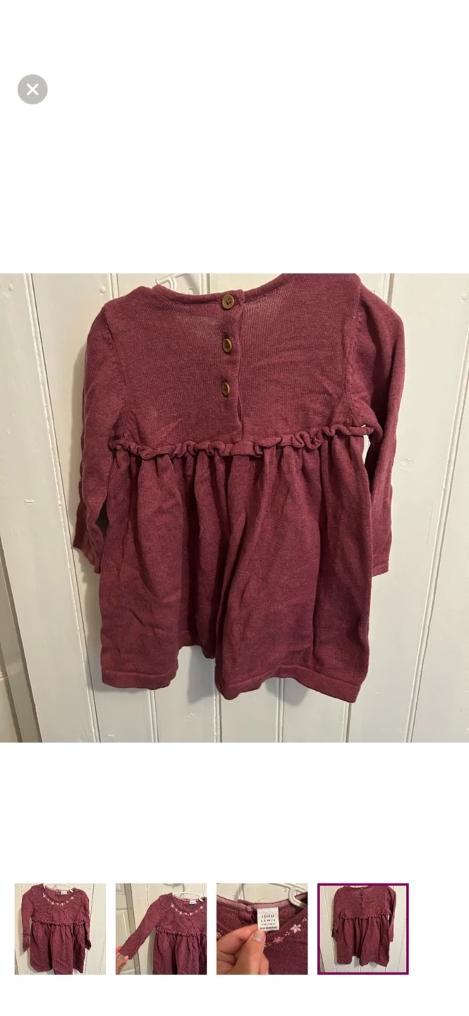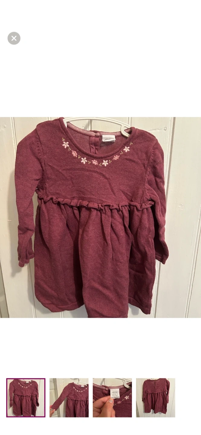 John Lewis brand. Long sleeve knit dress. Burgundy with floral embroidery neckline. Size 9/12m. Brand new condition