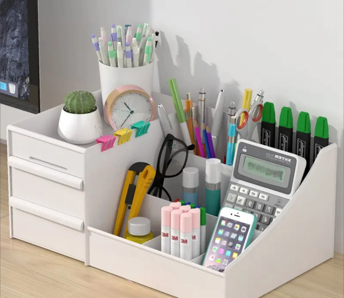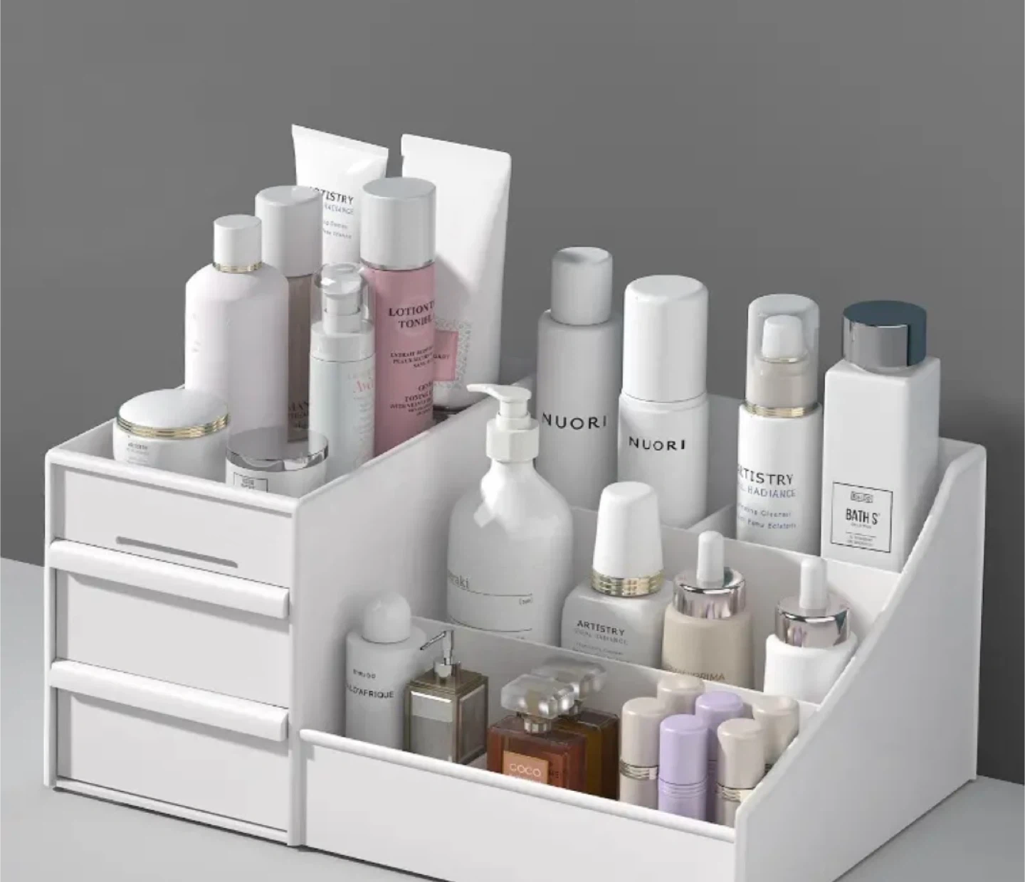Declutter your space with this handy white cosmetic organizer! It features multiple compartments and drawers to keep all your beauty essentials neatly organized. Perfect for makeup, skincare, and more