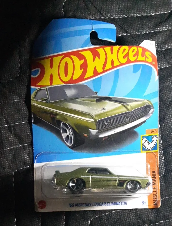Selling a Hot Wheels '69 Mercury Cougar Eliminator! It's part of the Muscle Mania series and is brand new in its original packaging, perfect for collectors and kids aged 3+
