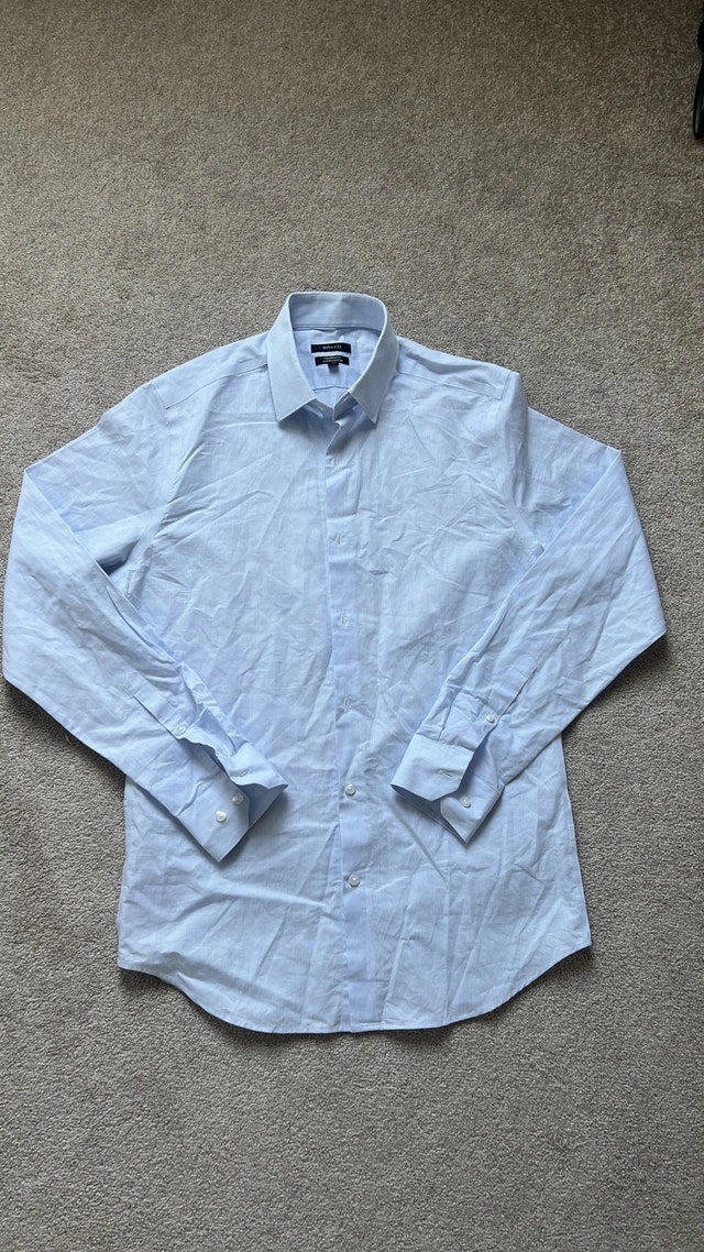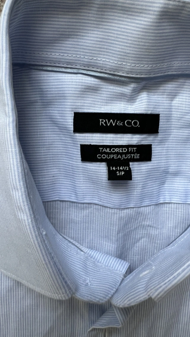 This is a tailored fit RW&CO dress shirt, perfect for any occasion. It's in good condition, with no noticeable wear and tear. It is a size small.