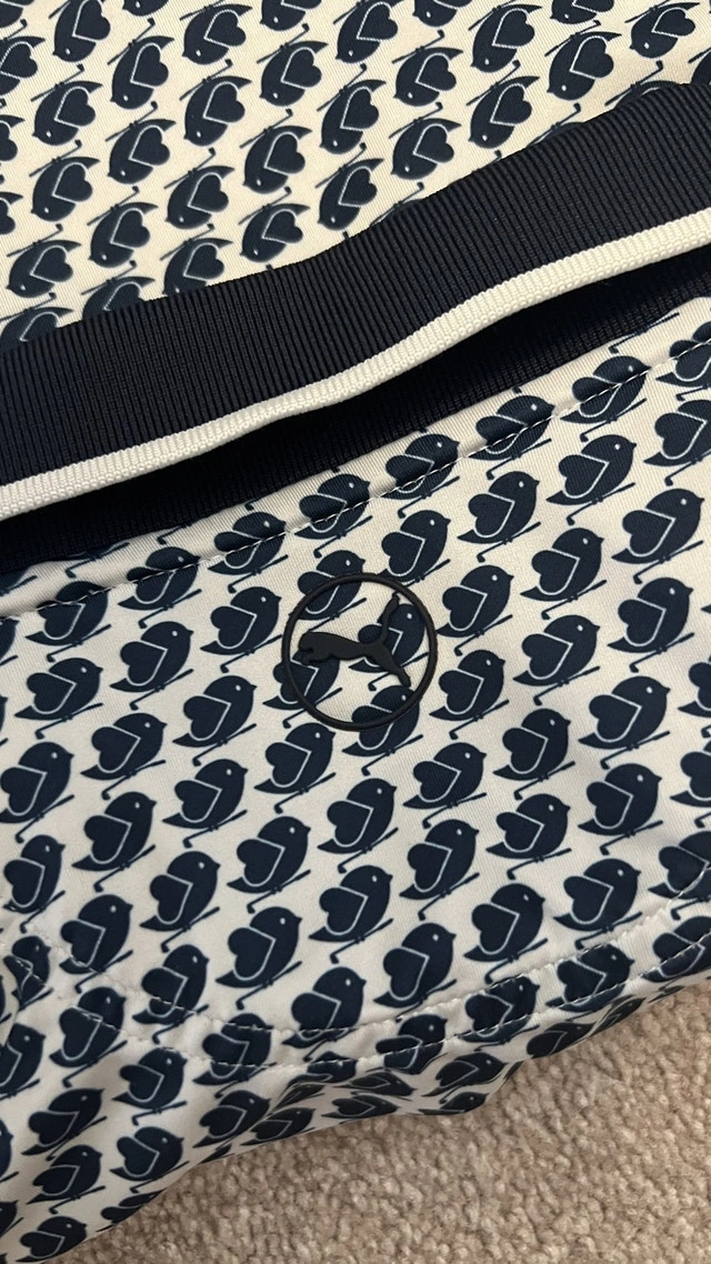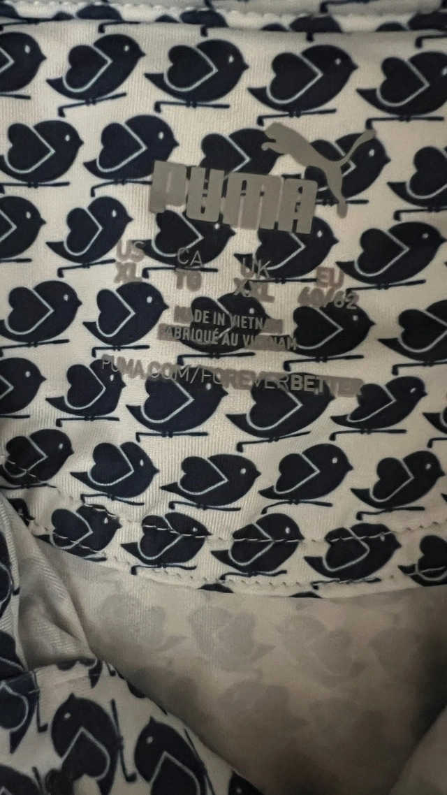 Elevate your golf game with this stylish, gently worn Puma polo shirt, perfect for a day on the green; it features a unique bird pattern on a white background and a dark blue collar. Here are some additional details: