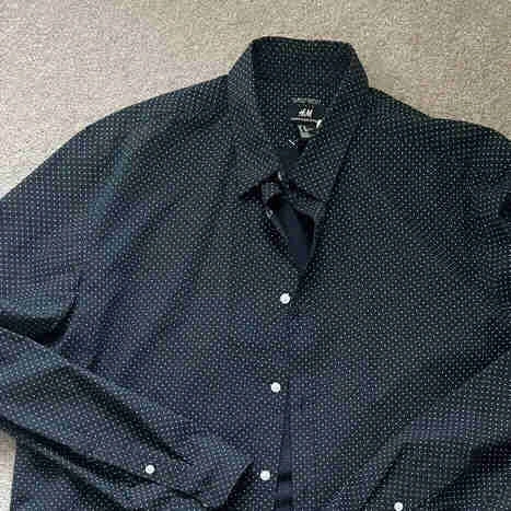 This is a stylish H&M dress shirt in size XL, featuring a slim fit and an easy-iron fabric with a dotted pattern. This shirt has been worn a few times but is still in good condition.