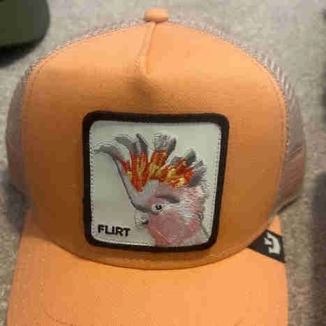 Spice up your wardrobe with this vibrant, Goorin Bros trucker hat, showcasing a fun "Flirt" bird patch on the front. Though it's been on a few adventures, it's still in good shape and ready to turn heads!