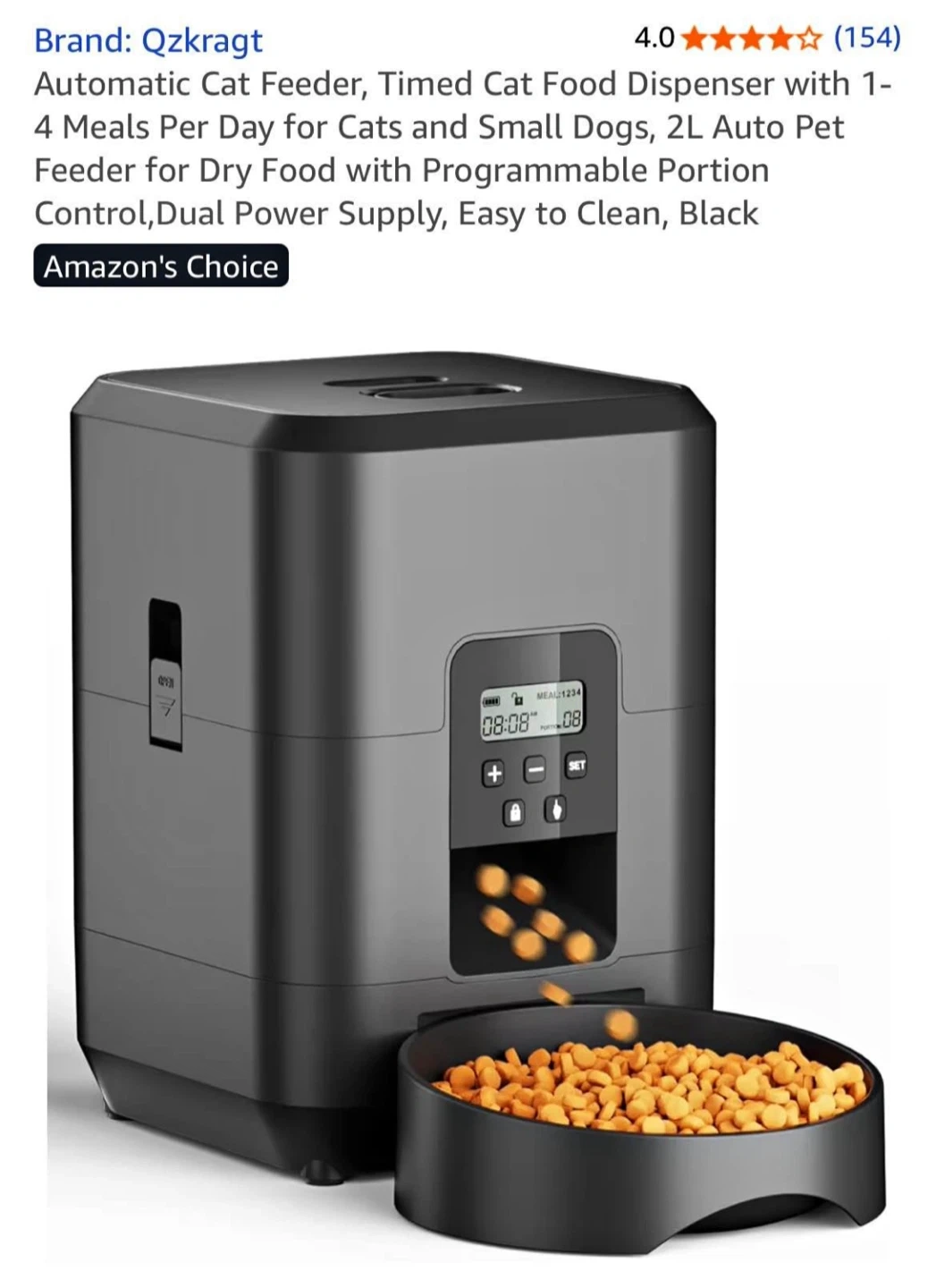 Selling a Qzkragt automatic pet feeder for cats and small dogs. It's a timed cat food dispenser that can provide 1-4 meals per day. It has a 2L capacity and is suitable for dry food. Programmable portion control and dual power supply make it easy to use and keep your pet fed on schedule. Charging cable is included.