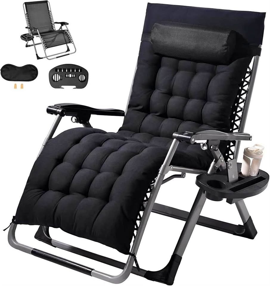 Featuring a robust triangular frame, reinforced square steel tubes, 8mm aluminum locks, and double-layer elastic cords, this 33" zero gravity chair offers exceptional stability and supports up to 500lbs. Ideal for users of all sizes. Customize your relaxation with our zero gravity recliner's adjustable design, ranging from 90 to 170 degrees. Includes a removable 10cm thick plush cushion for ultimate comfort. The 8mm aluminum locks are durable and resistant to breakage. This anti gravity chair is designed with a safety pin mechanism to prevent pinching during adjustment. Comes with multiple practical accessories including a detachable tray with cup holder and phone stand, and a headrest, eye mask, and earplugs.