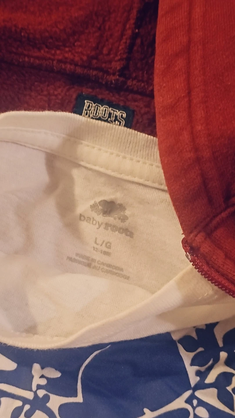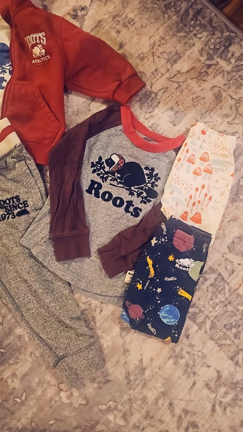 Selling a bundle of Roots baby clothes in size M (12m-3t). Includes a variety of items like a hoodie, t-shirts, pants, and a onesie. All items feature the classic Roots logo and designs! Great condition!