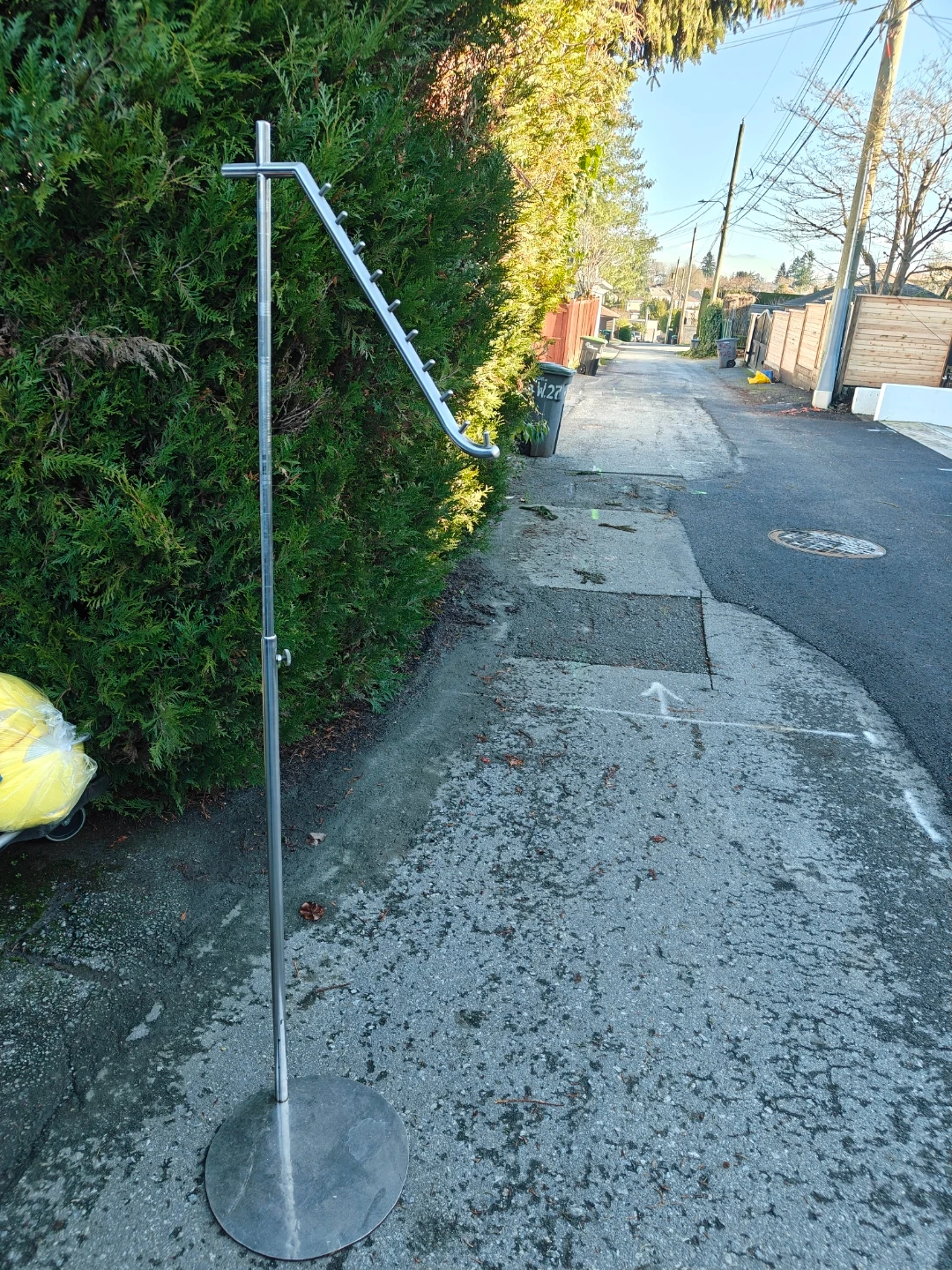 Selling a sturdy, adjustable metal clothing rack. It's perfect for organizing your clothes or displaying them in a retail setting. The rack features a round base for stability and an adjustable height for customized use. Great for extra storage!