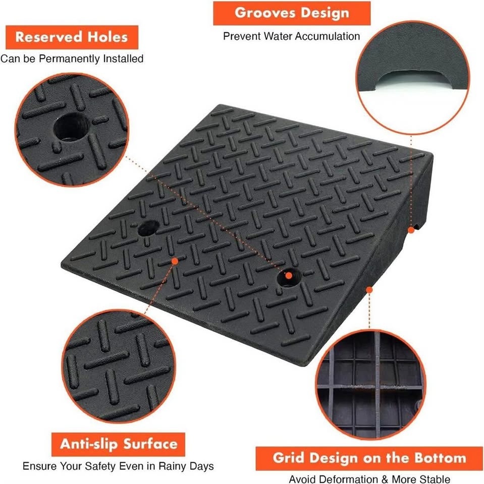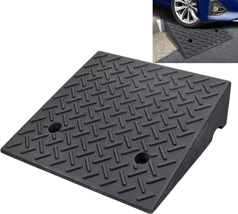 Our curb ramp is 19.6 x 19.6 x 6", which is longer and wider than other ramps. The 6" height curb ramp is suitable for most driveways and sidewalks. The extended length ramps smooth out the slope to a tilt degree of 17 for enhanced traction and smooth passage of vehicles. 2 reserved holes are for permanent installation.