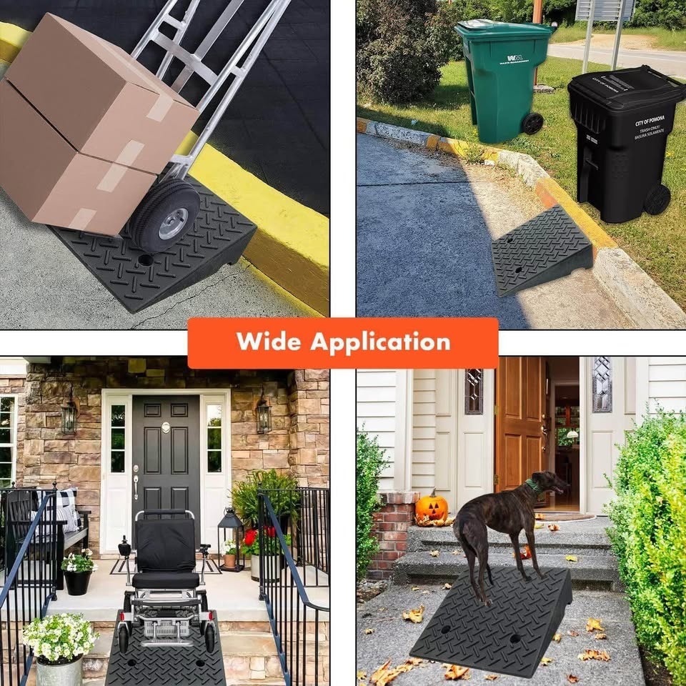 The curb ramp is ideal for cars, trucks, motorcycles, RVs, bikes, trailers, wheelchairs, trolleys, lawn mowers, and pets. Suitable for curb, driveway, garages, loading dock, warehouses, barns, shops, and stores