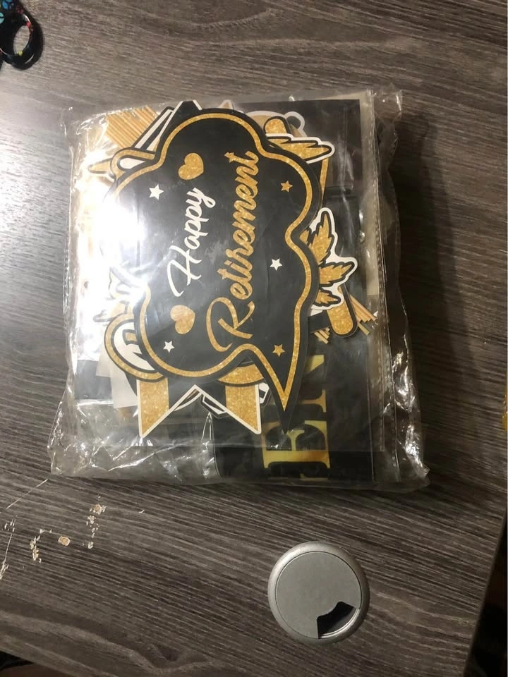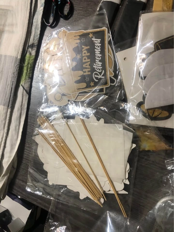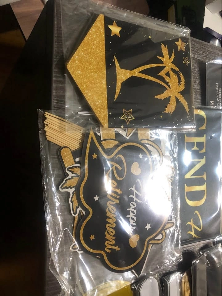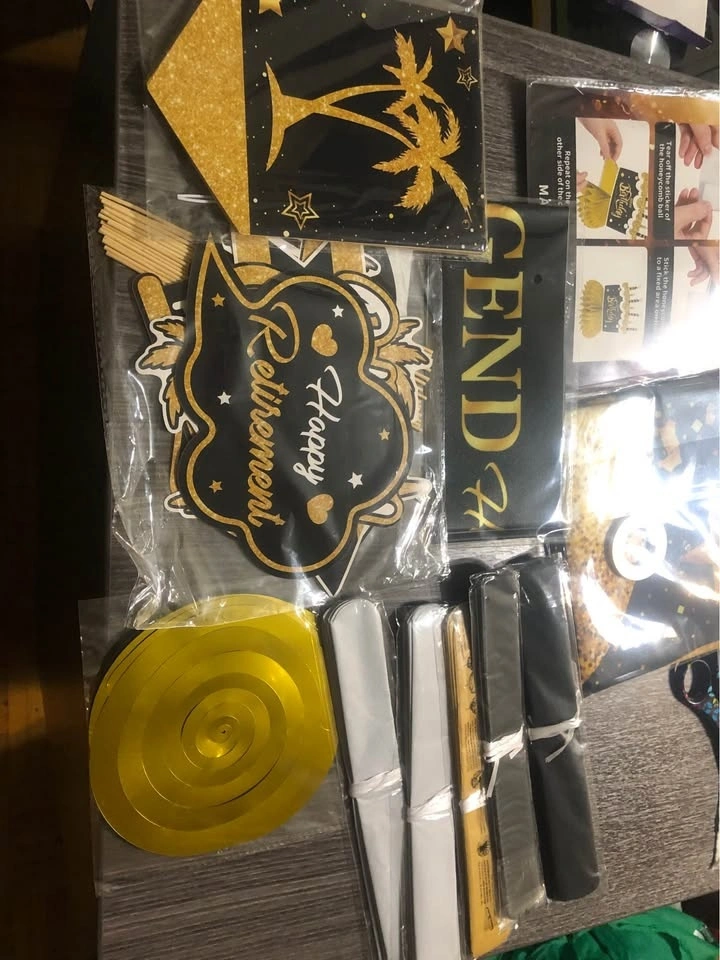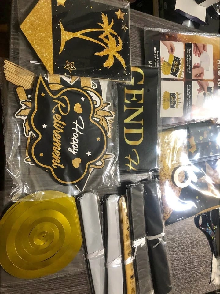 Brand new retirement party decoration set! Includes various black and gold decorations to celebrate a happy retirement. Perfect for adding a festive touch to your party!