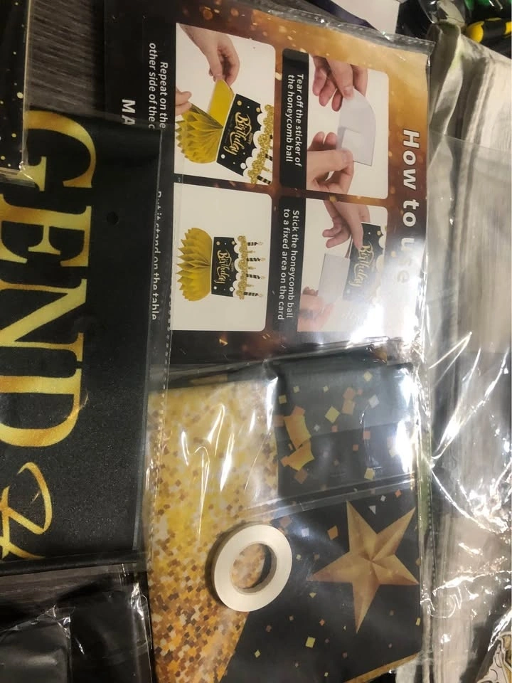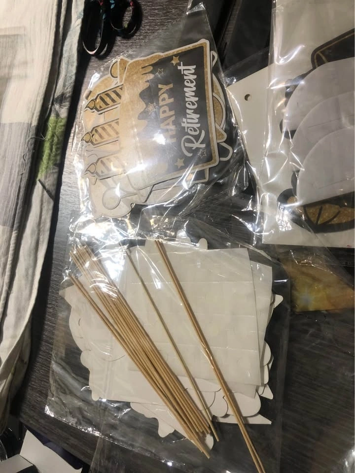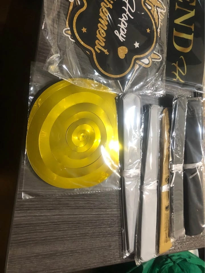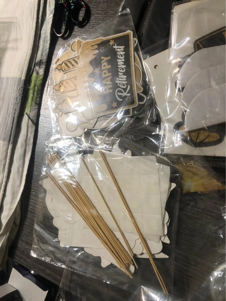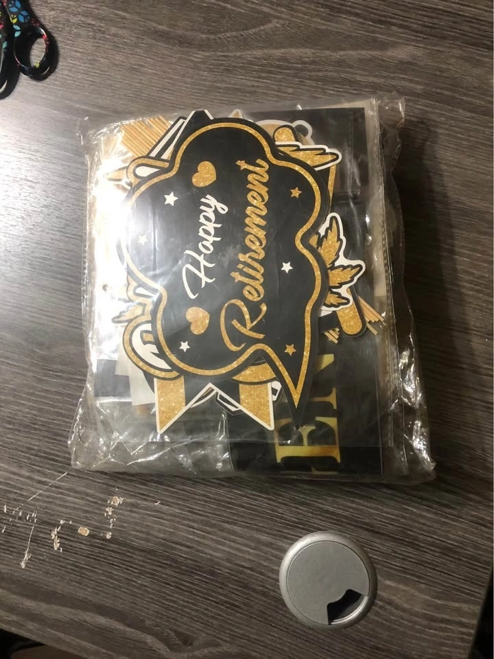 Brand new retirement party decoration set! Includes various black and gold decorations to celebrate a happy retirement. Perfect for adding a festive touch to your party!