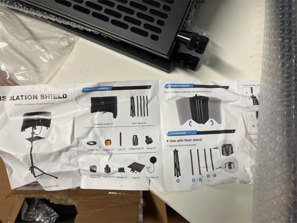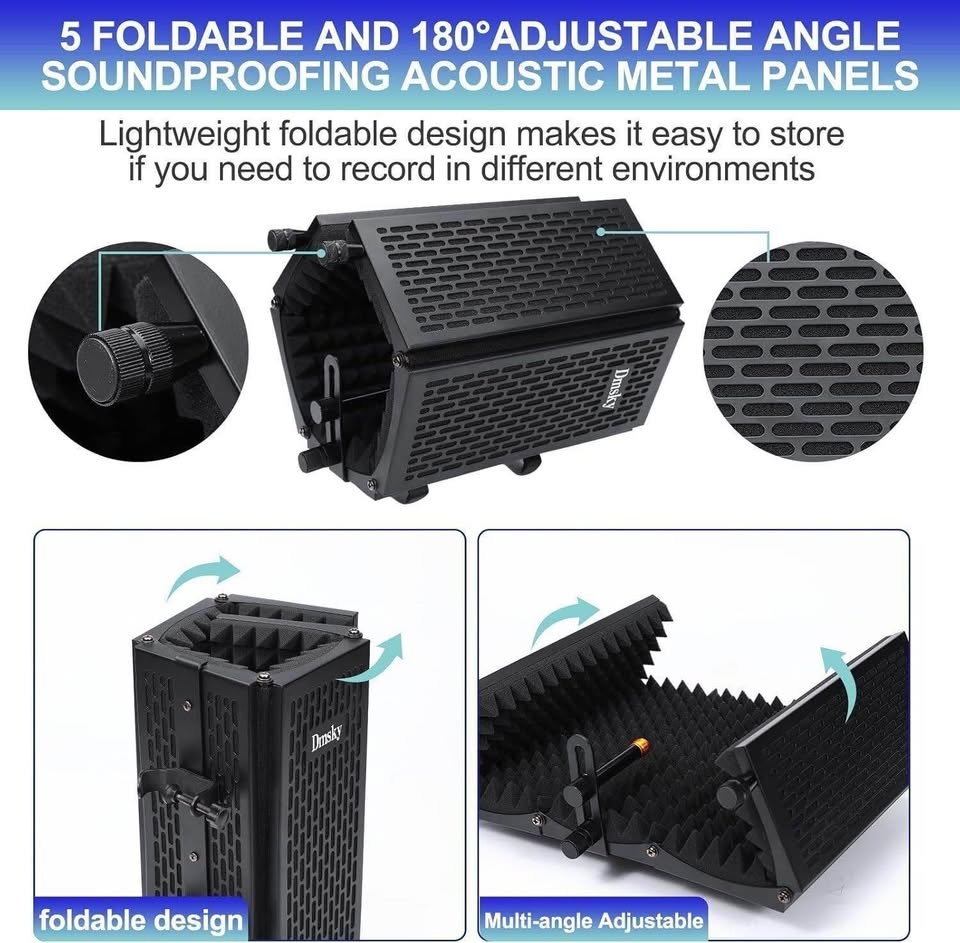 Excellent noise reduction with triple sound insulation: reflective, filter, and absorbing layers. The high-density acoustic foam eliminates audio wave interference, reducing noise from external environments. Durable steel mic stand with non-slip acoustic panel support points and premium steel screws. The back panel is made of strong and durable metal. Flame-retardant sound insulation material. Equipped with a heavy-duty tripod. The stand can be used on a desk or mounted to a boom. The 5 folding microphone shield panels are adjustable at 180 degrees. Includes a pop filter and a 3/8" to 5/8" adapter, plus a storage tray.