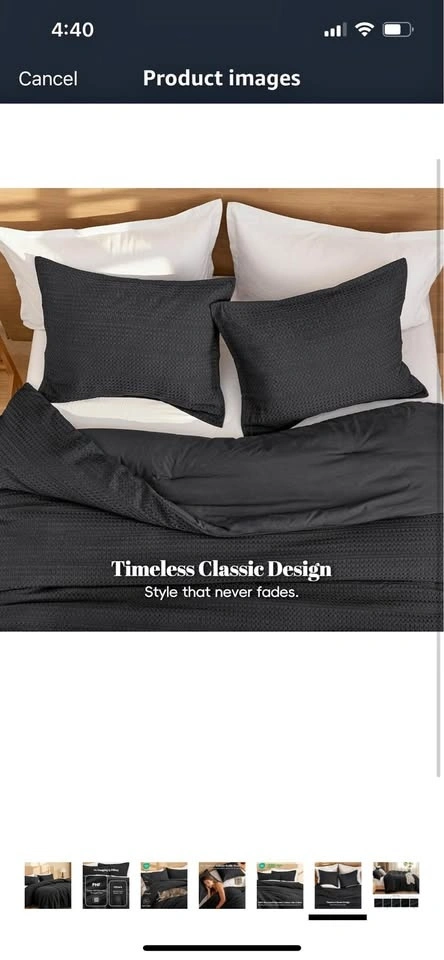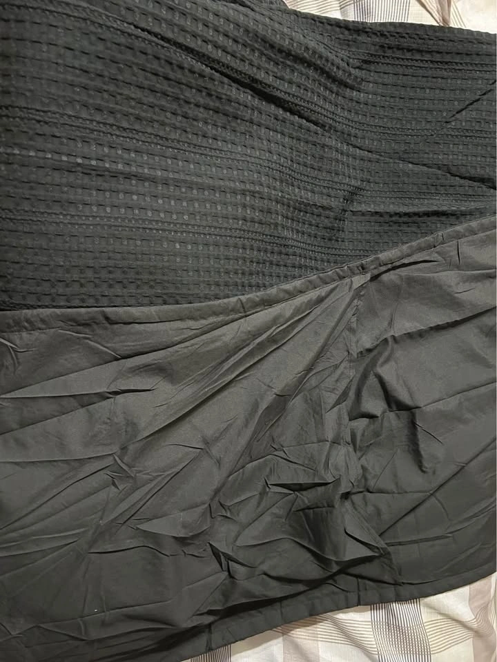 This is a brand new PHF heavyweight black waffle weave comforter set. The material is 100% polyester. King bedding set includes 1 comforter 104" x 90", 2 pillow shams 20" x 36", fits King sizes bed .It features a timeless classic design and is made with 100% recycled polyester, a cotton-like fabric blending environmental responsibility with everyday comfort!
