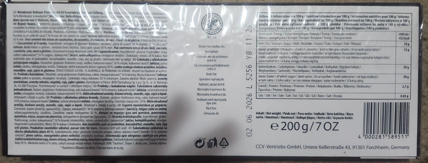 Selling a box of Caractere Weinbrand Bohnen chocolates. These are Cioccolatini al Brandy, a delicious treat! The net weight is 200g / 7 OZ. Best before 2026 June 02