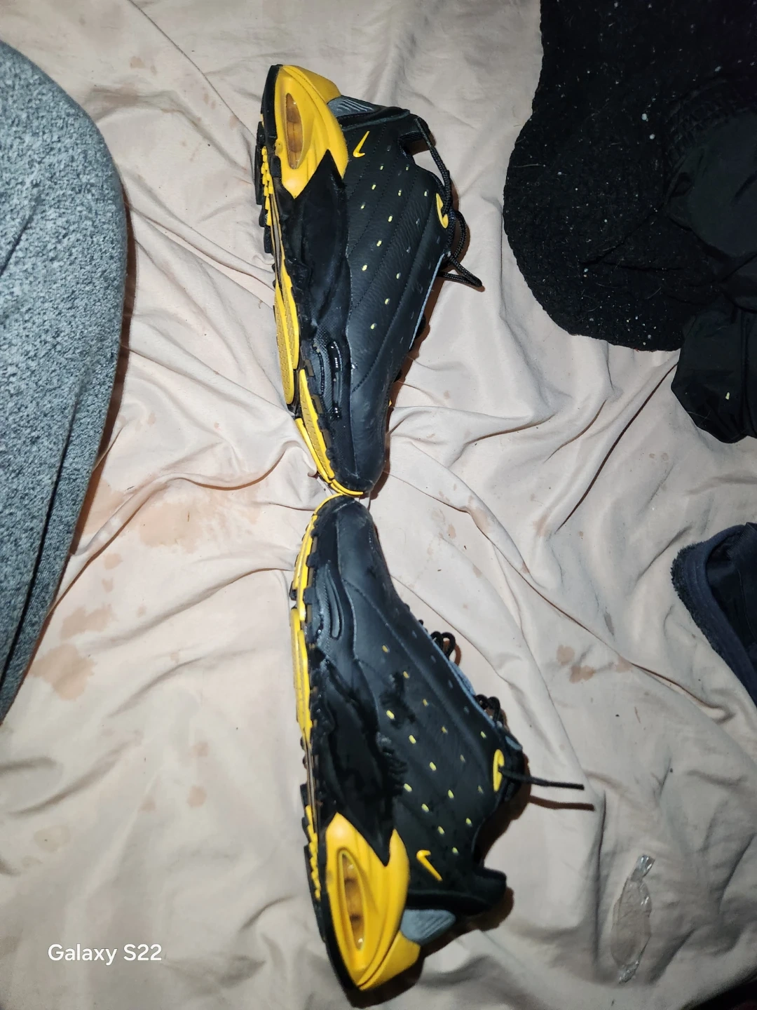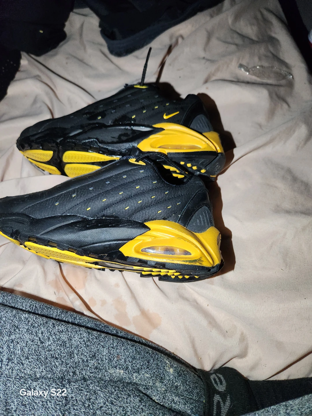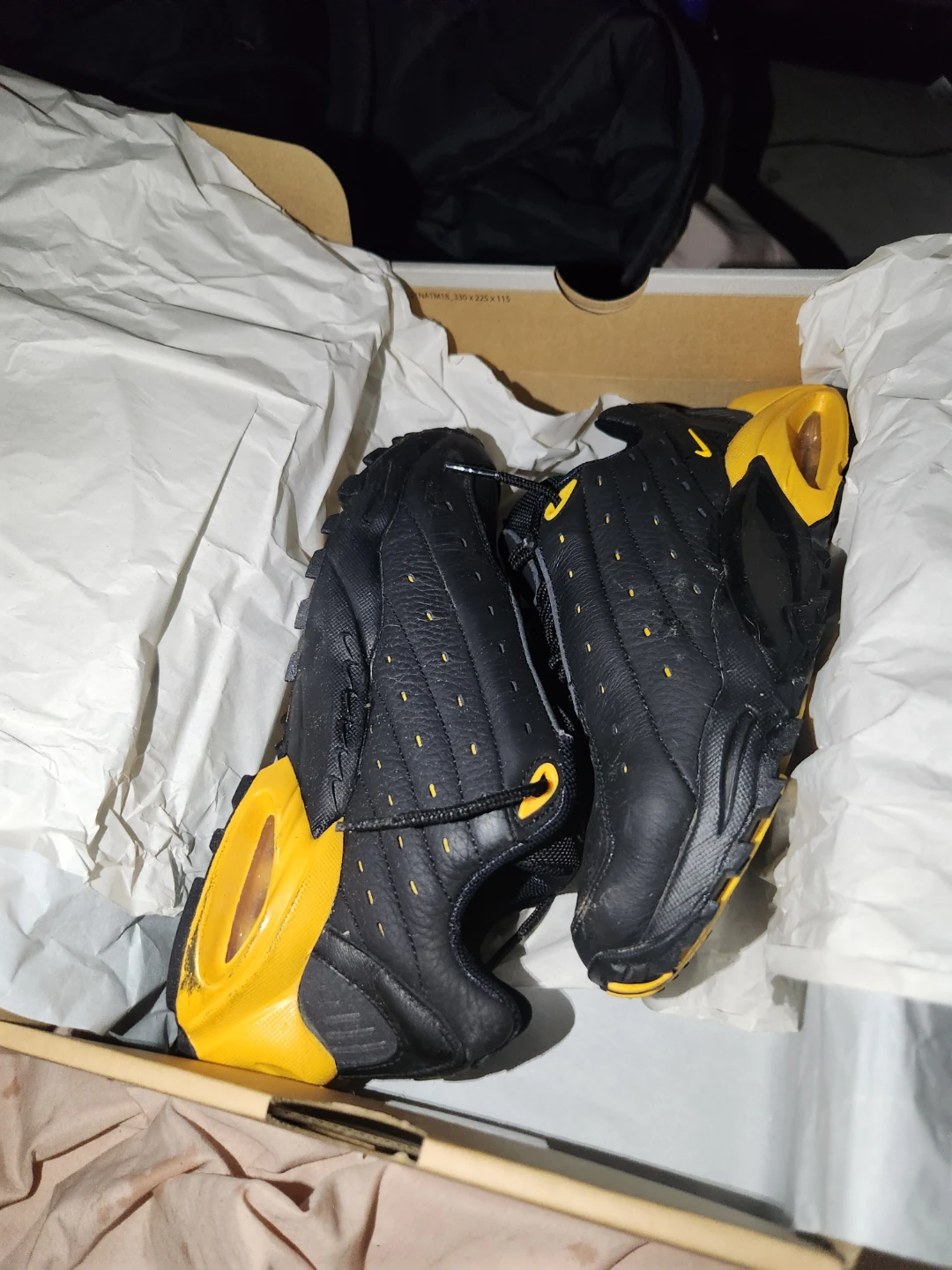 Selling a pair of Nike Air Max Plus TN sneakers in black and yellow. They are in used condition, with some visible wear, but still have plenty of life left. Great for casual wear or hitting the gym!