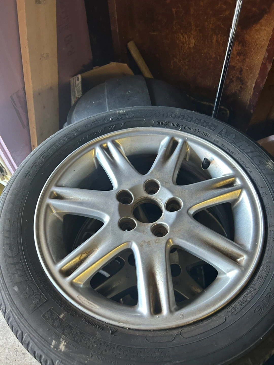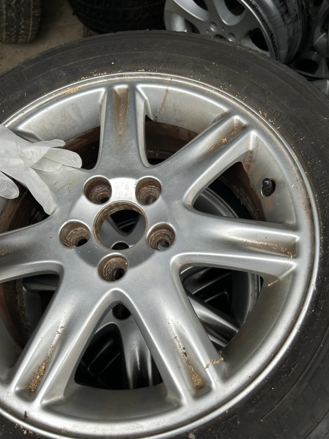 Selling a used silver aluminum alloy car wheel. It has some signs of wear, but is still in usable condition. Perfect as a spare or replacement!