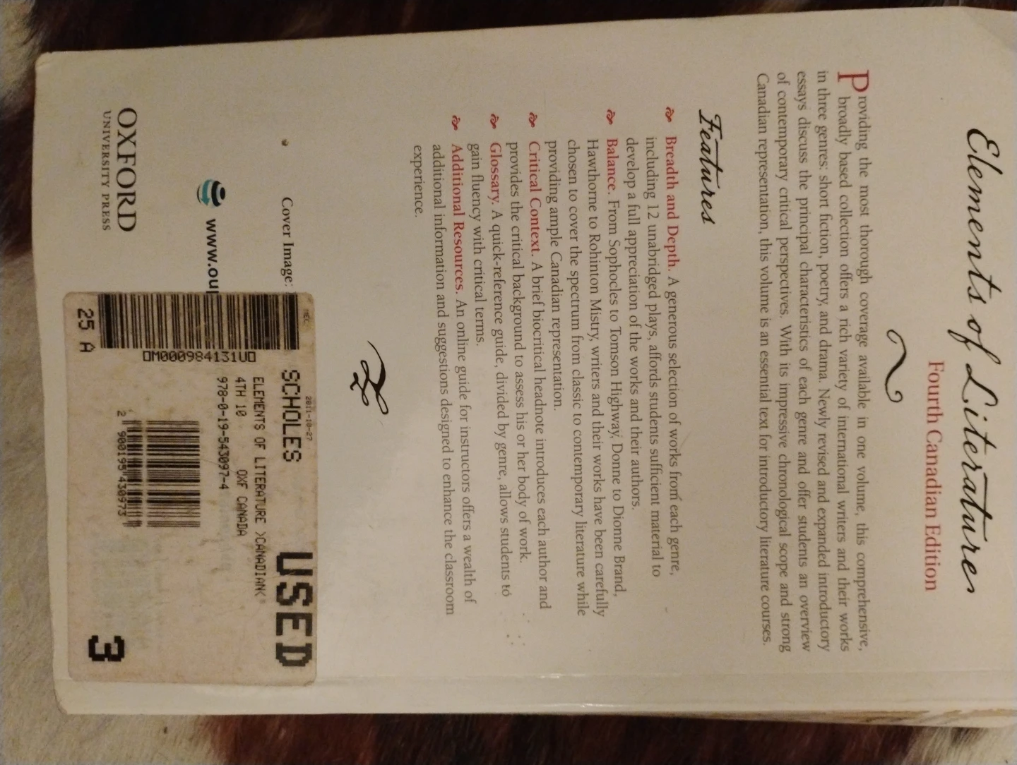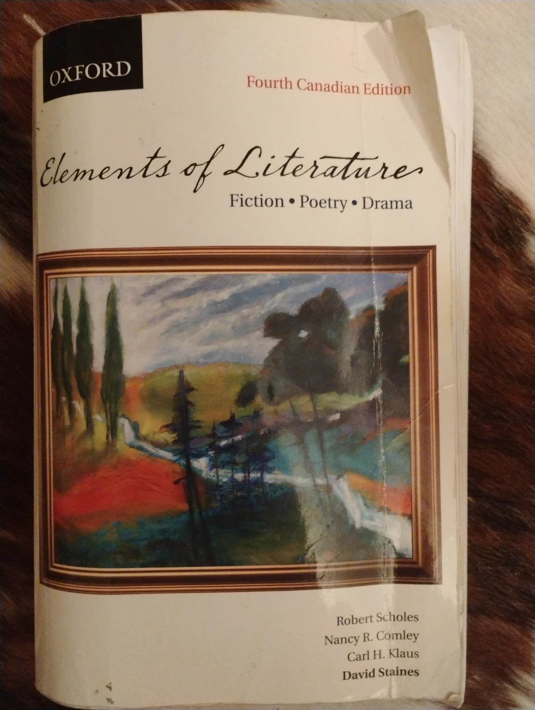 Selling a used copy of Oxford's Elements of Literature, Fourth Canadian Edition. This comprehensive collection offers a rich variety of works in three genres: fiction, poetry, and drama. It's a great resource for students!
