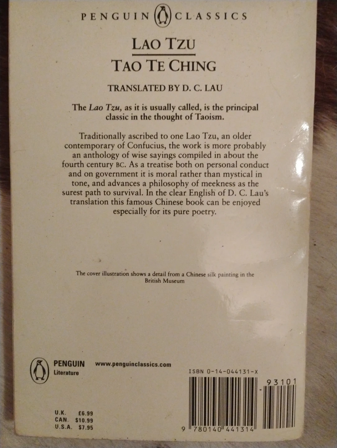 Selling a copy of Lao Tzu's Tao Te Ching from Penguin Classics! It's translated by D. C. Lau, a classic in the thought of Taoism. The cover illustration shows a detail from a Chinese silk painting in the British Museum. A great read for anyone interested in philosophy or Eastern thought