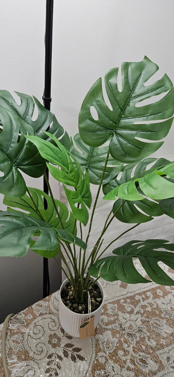 Selling a faux monstera plant in a stylish white pot! It's a great way to add some greenery to your space without the hassle of watering. Perfect for any room or office