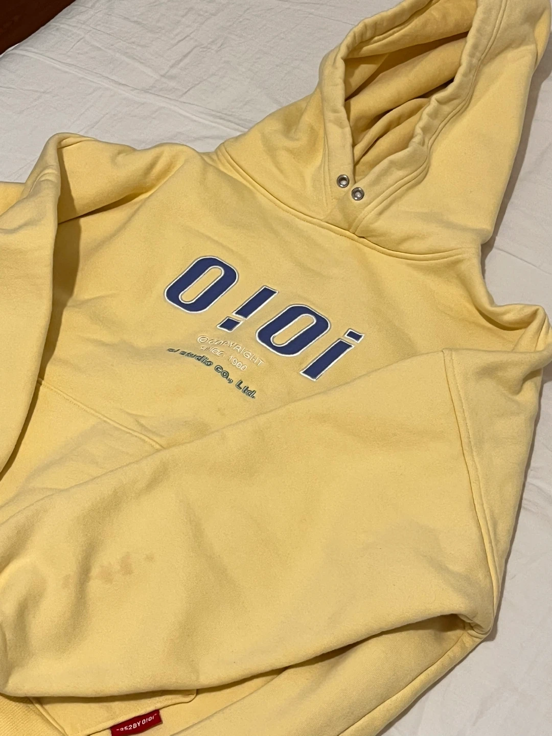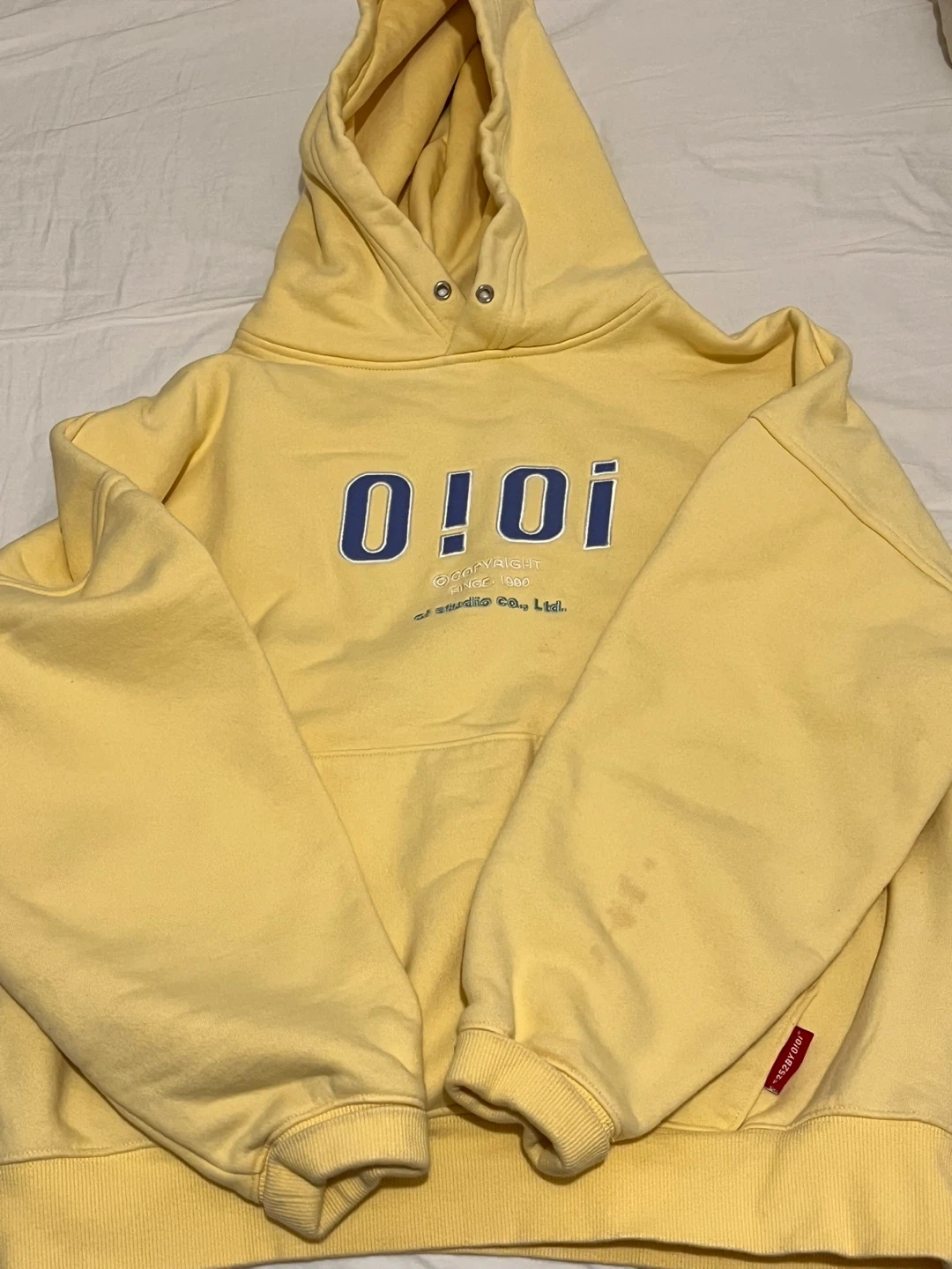 Selling a yellow O!Oi hoodie. It has the brand's logo on the front. There are some signs of wear, as shown in the photos.