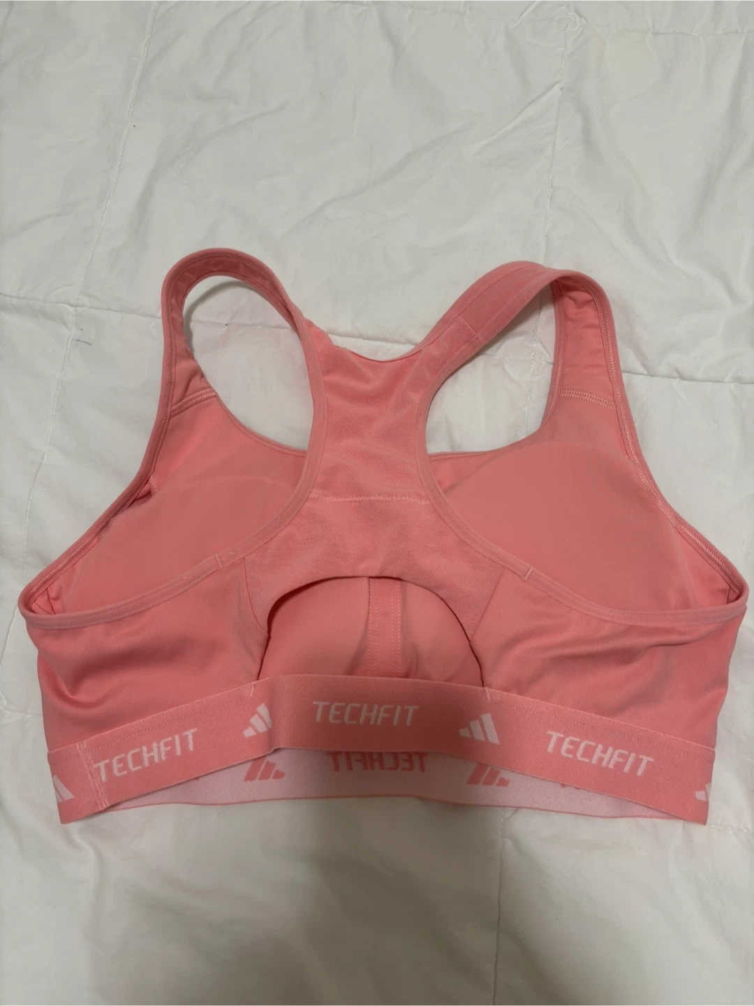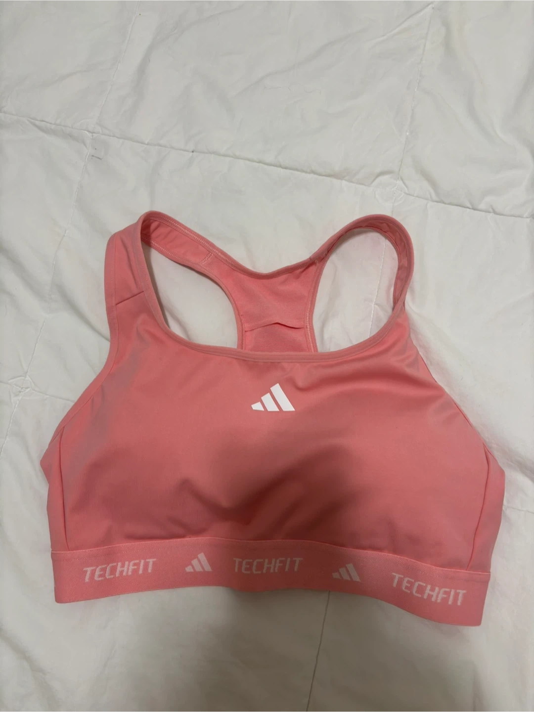 Selling an Adidas Techfit sports bra in a lovely pink colour! It's in great condition and ready for your next workout. The Techfit design provides excellent support and comfort. Perfect for running, yoga, or any activity you enjoy