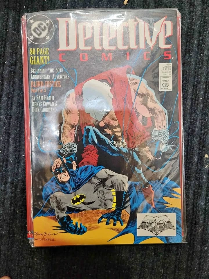 80 page giant. Blind Justice: 1 of 3 - The villain known a Bonecrusher just won't stay dead in Batman's 50th Anniversary adventure "Blind Justice." Part 1 of 3, continued next issue. Written by Sam Hamm. Pencils by Denys Cowan. Inks by Dick Giordano & Frank McLaughlin. Pin-ups by David Mazzucchelli, Kevin Maguire, Gene Day & Dan Day & David Day, Jim Aparo, Norm Breyfogle, John Beatty, Howard Chaykin, Carmine Infantino & Joe Rubinstein, Tim Truman. Text tributes by Terry Gilliam (filmmaker), Mark Evanier, Thomas M. Disch (poet and novelist), John Coyne (writer), Ric Meyers (writer), Harlan Ellison, Will Murray, Tom Fagan (chief Batmanian), Jim Shooter. Cover by Cowan & Malcolm Jones III.