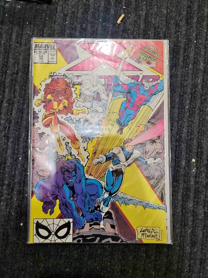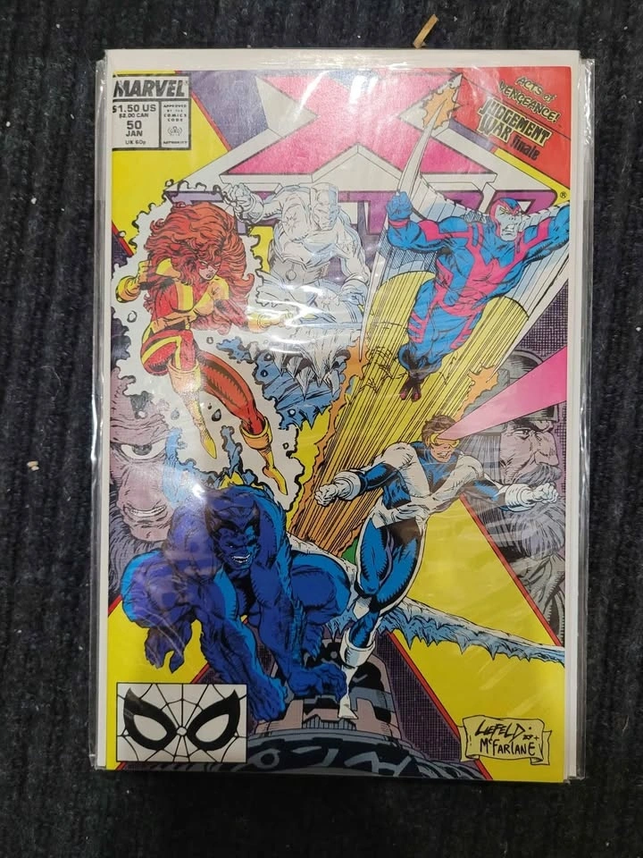 Judgement War! Acts of Vengeance tie-in. Double-Sized Issue. Part 7 of 7. Story by Louise Simonson. Art by Rich Buckler and Al Milgrom. Cover by Rob Liefeld and Todd McFarlane. This is it, the explosive conclusion to the Judgement War. X-Factor is reunited just in time for the final judgement of the space-gods known as the Celestials. "Meanwhile back on Earth!" Story by Louise Simonson. Art by Terry Shoemaker and Hilary Barta. Will Apocalypse accept Loki's offer and join his Acts of Vengeance plot (see other Marvel titles from this time period for details on the Acts of Vengeance storyline). Plus, witness the transformation of Caliban.
