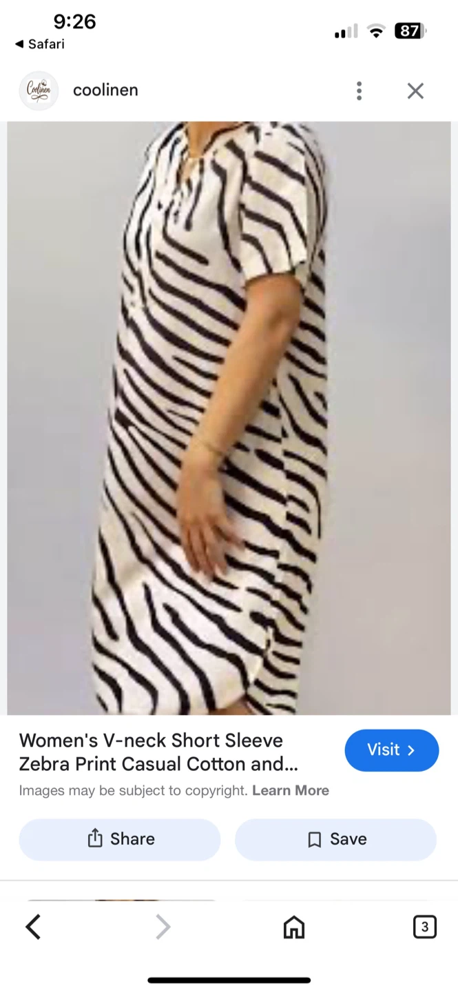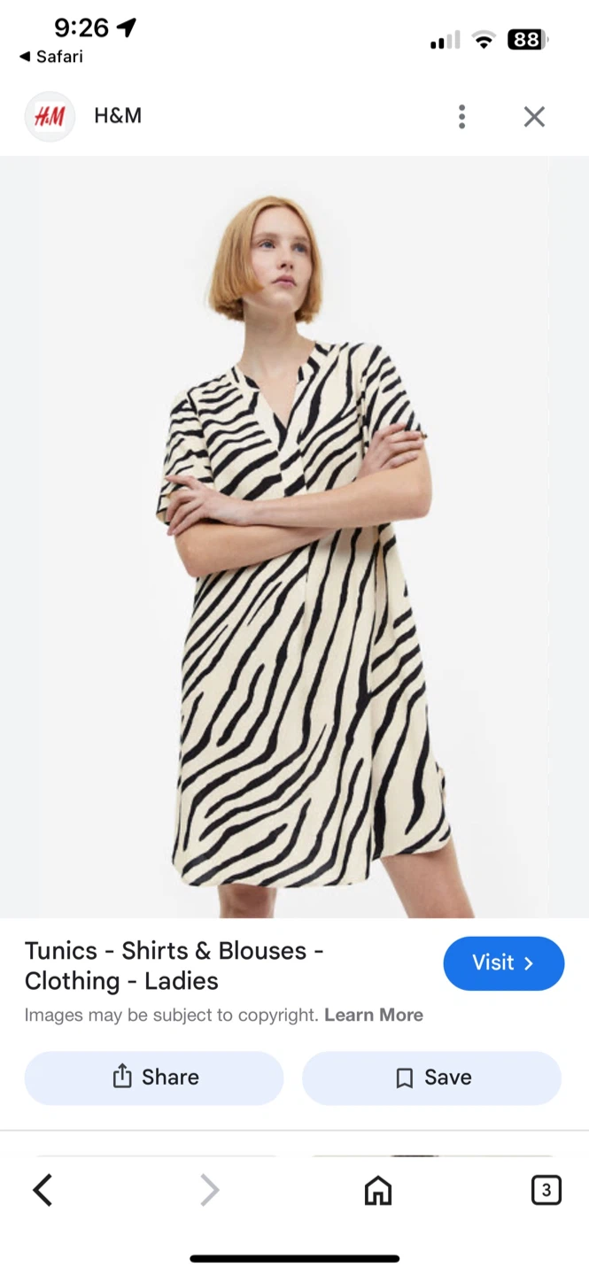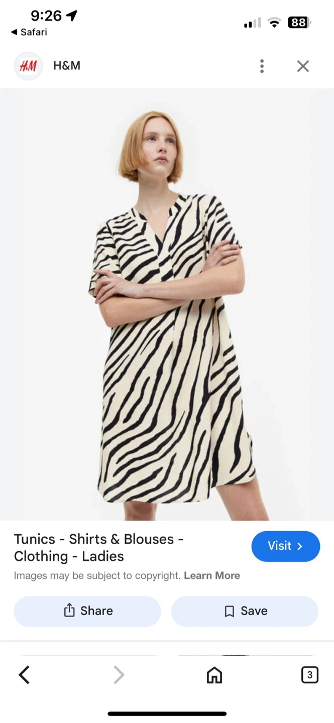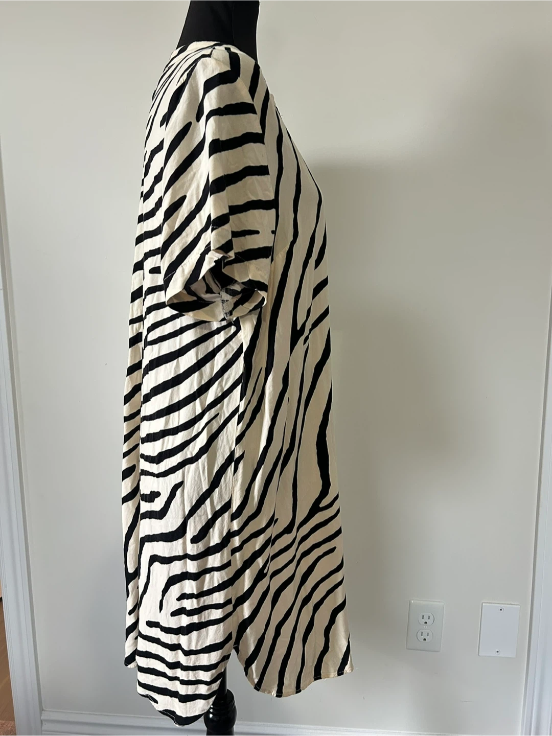 This is a cream and black zebra print knee length shift dress! It's a stylish and comfortable piece that's perfect for everyday wear. It's made of a soft, breathable material that will keep you cool and comfortable all day long