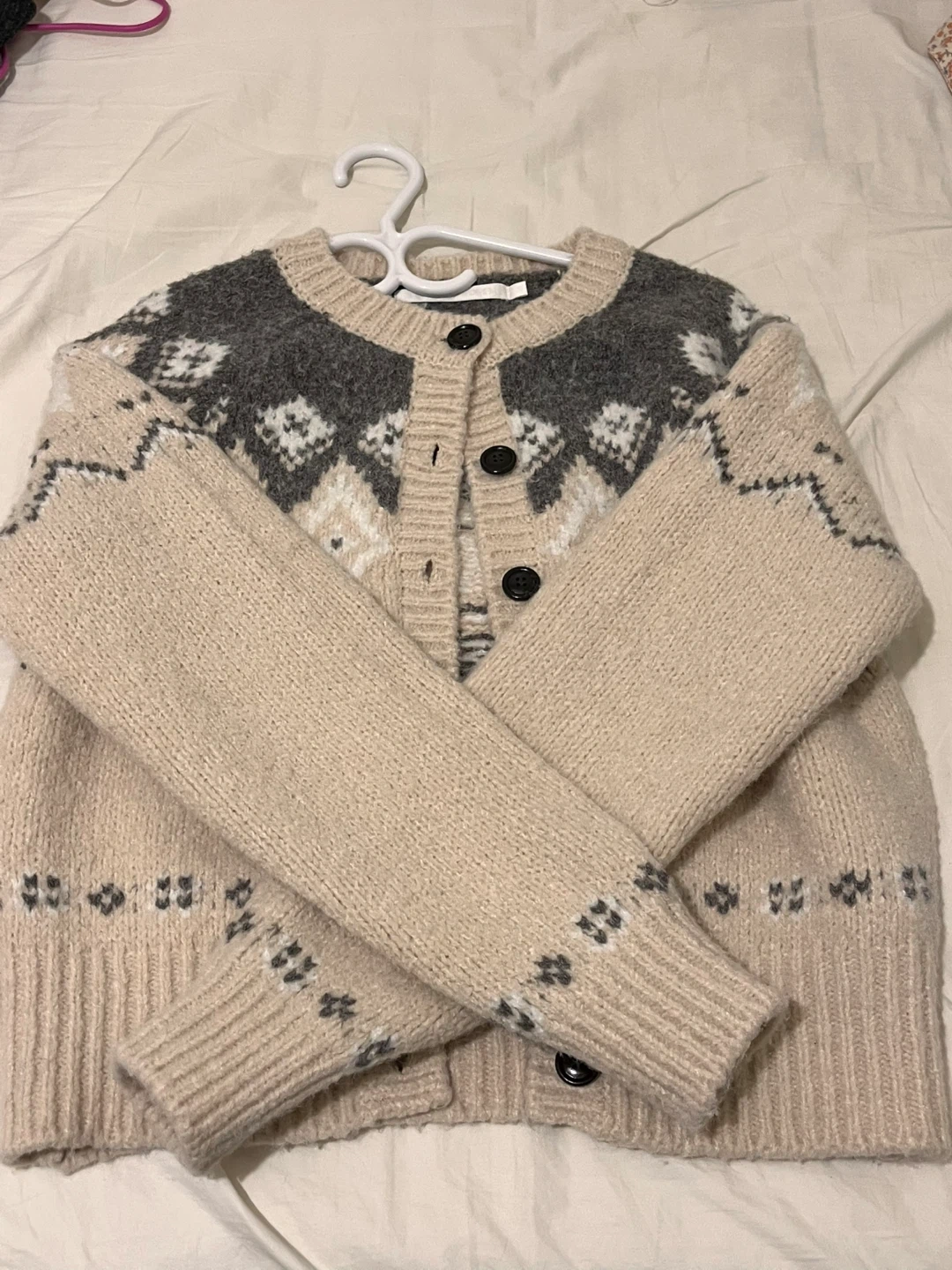 Cozy knit cardigan with a unique patterned design! It's in great condition and perfect for layering during the cooler months. The neutral colour makes it easy to pair with any outfit