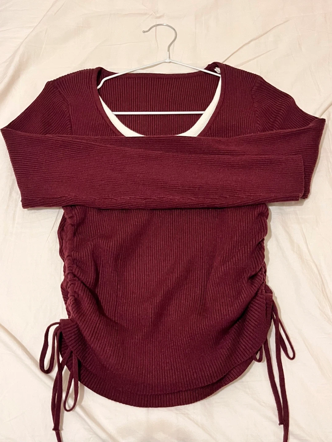 A cute burgundy ribbed knit top! It features a round neckline with a white trim and a drawstring detail on the sides. Perfect for layering or wearing on its own!