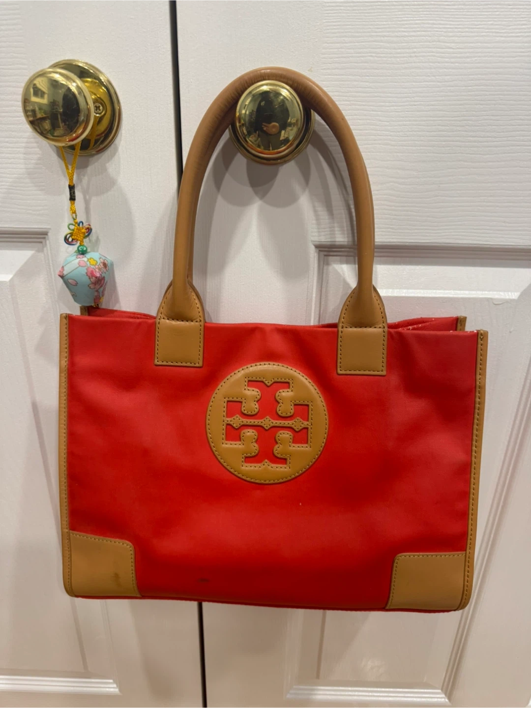 Selling a Tory Burch tote bag in red. It has the classic Tory Burch logo on the front. There are some signs of wear, as shown in the pictures. It's still a stylish bag for everyday use!