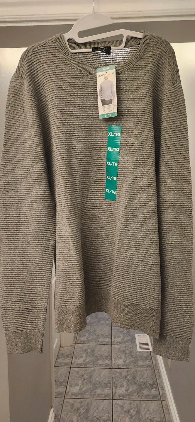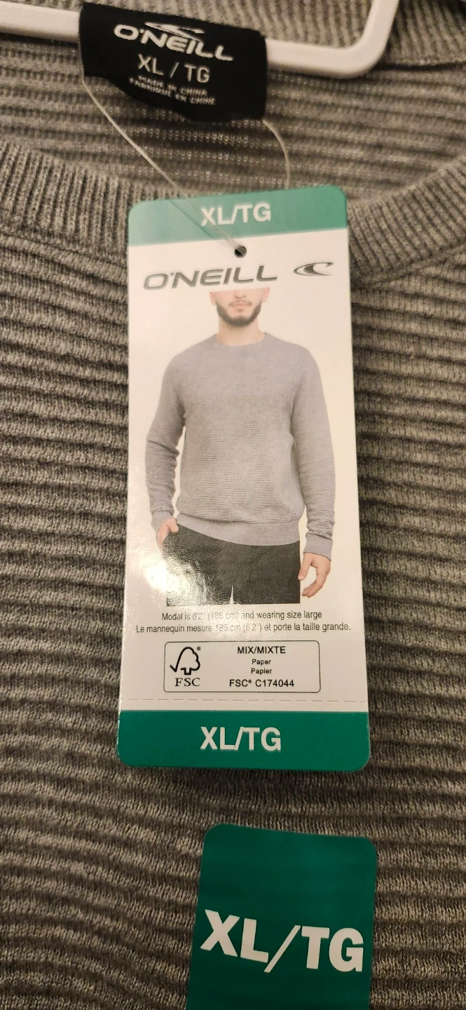 I'm selling a brand new O'Neill sweater, still with the tags attached! It's a size XL/TG and comes in a nice grey colour. Perfect for layering or wearing on its own. The texture is ribbed.