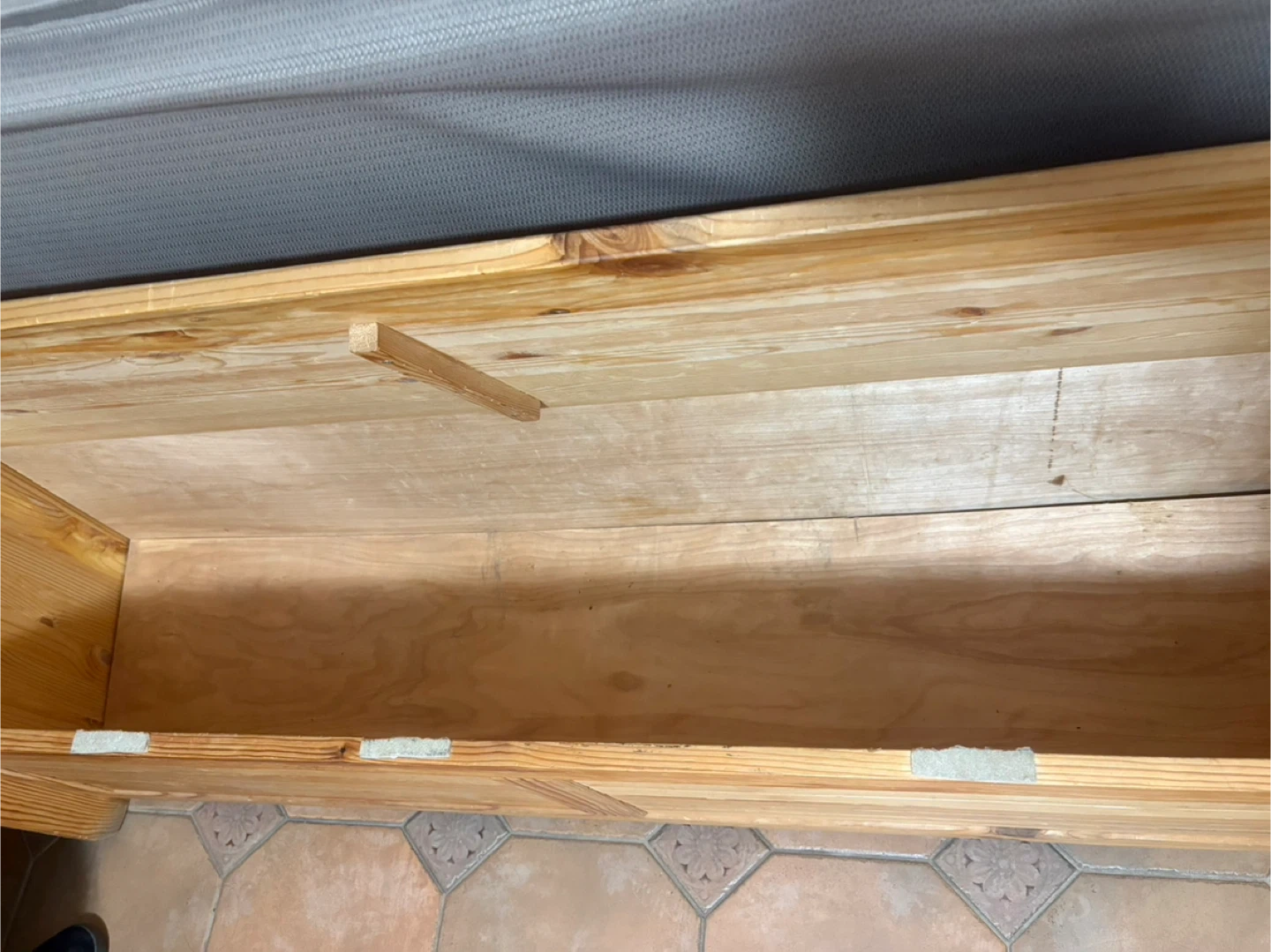 Selling a wooden storage bench in good condition. It's perfect for adding extra seating and storage to any room in your home. It can be used to store blankets, toys, or anything else you need to keep out of sight. The bench has a natural wood finish and a simple design that will complement any decor