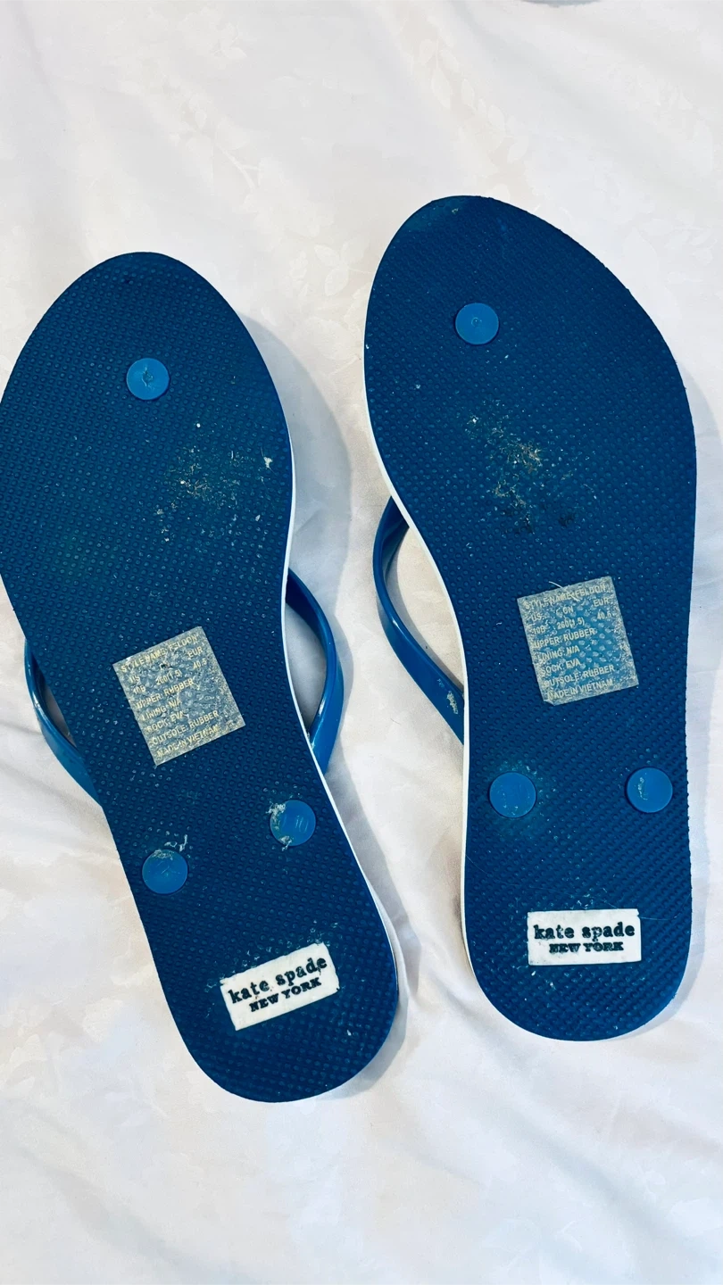 Cute Kate Spade flip flops with a fun sunglasses print! These are perfect for summer and adding a pop of color to your outfit. They have a blue strap and the Kate Spade logo on the sole