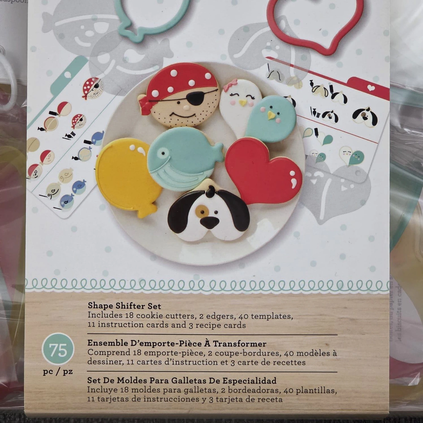 Brand new in box, 75 piece cookie cutter set that includes cookie cutters, templates and recipes.
