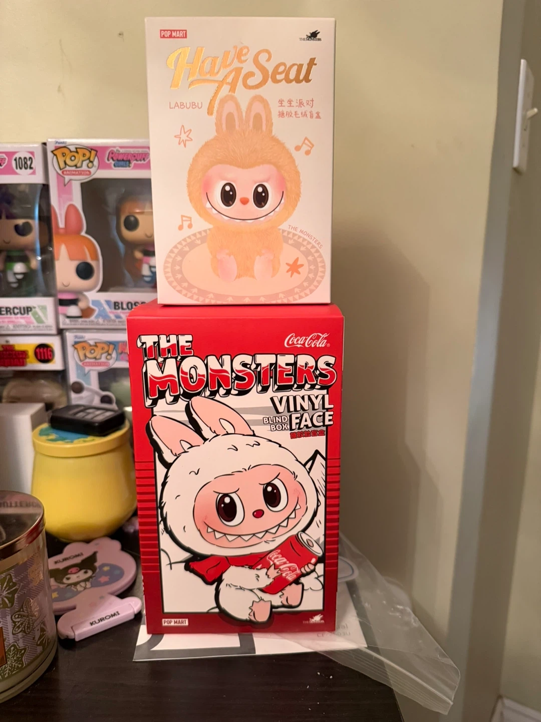 Selling two Pop Mart blind boxes! One is The Monsters Vinyl Face series with Coca-Cola, and the other is Labubu's Have A Seat series. Both are in great condition and ready for a new collector!