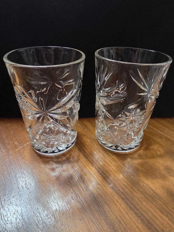 5 Vintage Anchor Hocking early American prescut (EAPC) clear glass flat juice glasses, also known by the "star of David" or "starburst" pattern name.