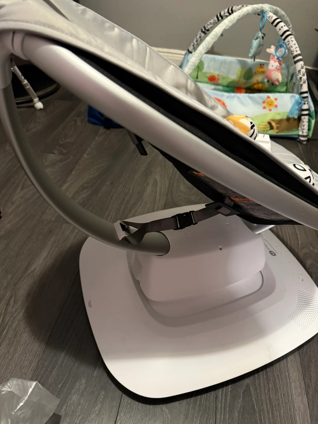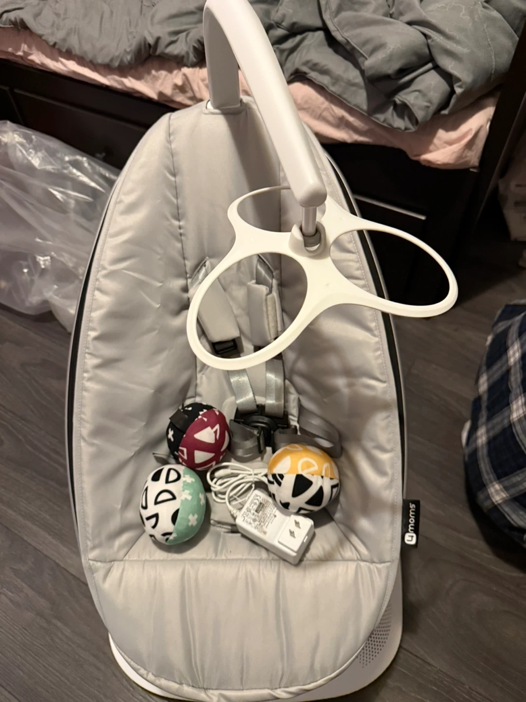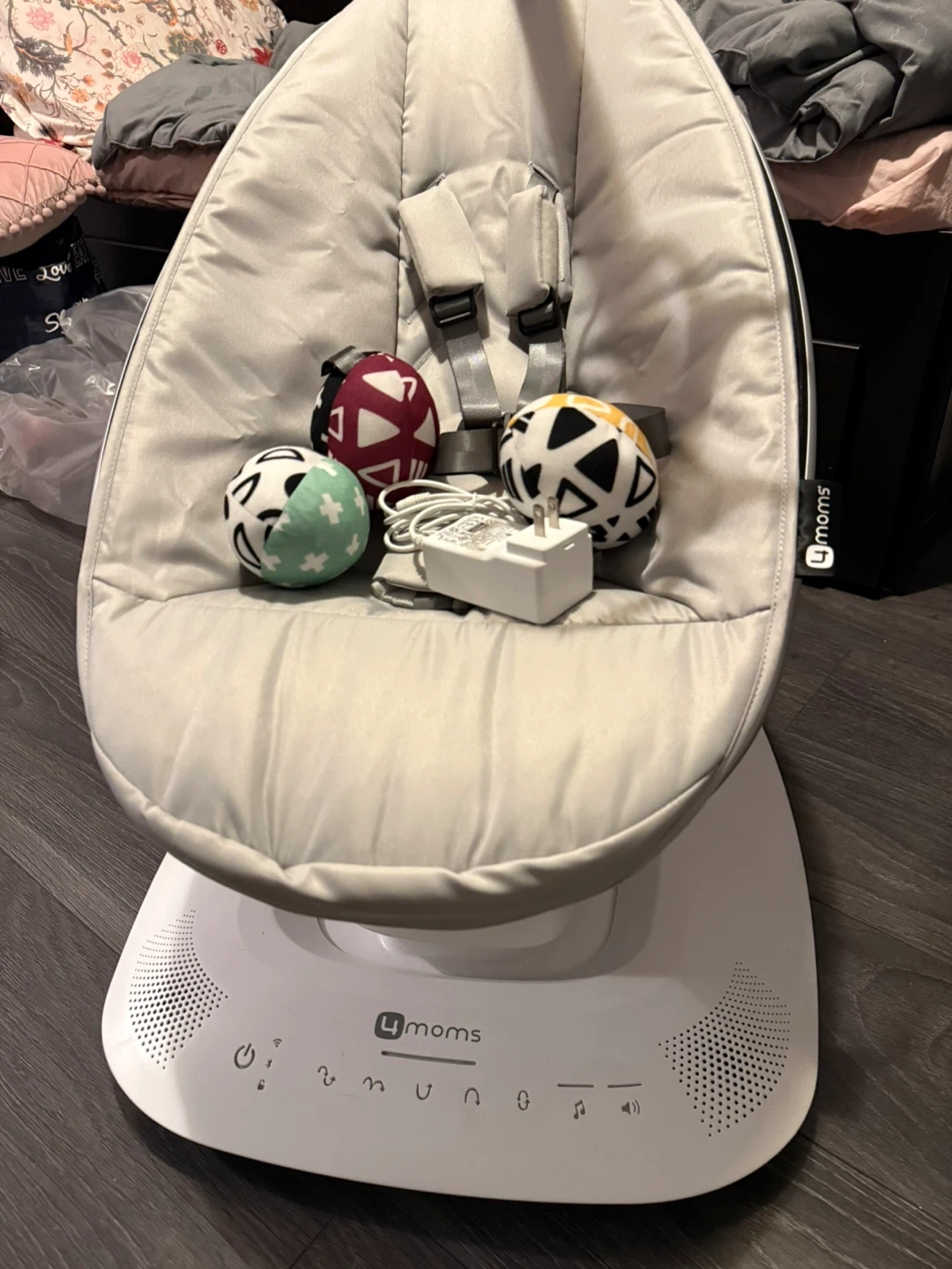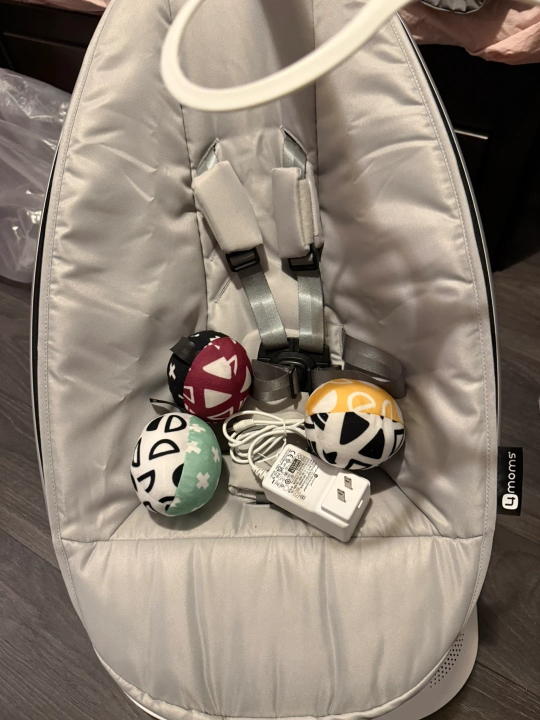 Selling a 4moms MamaRoo baby swing. It's in great condition and comes with the original power adapter and three colorful plush balls to keep your little one entertained. This swing is perfect for soothing and entertaining your baby with its various motions and built-in sounds