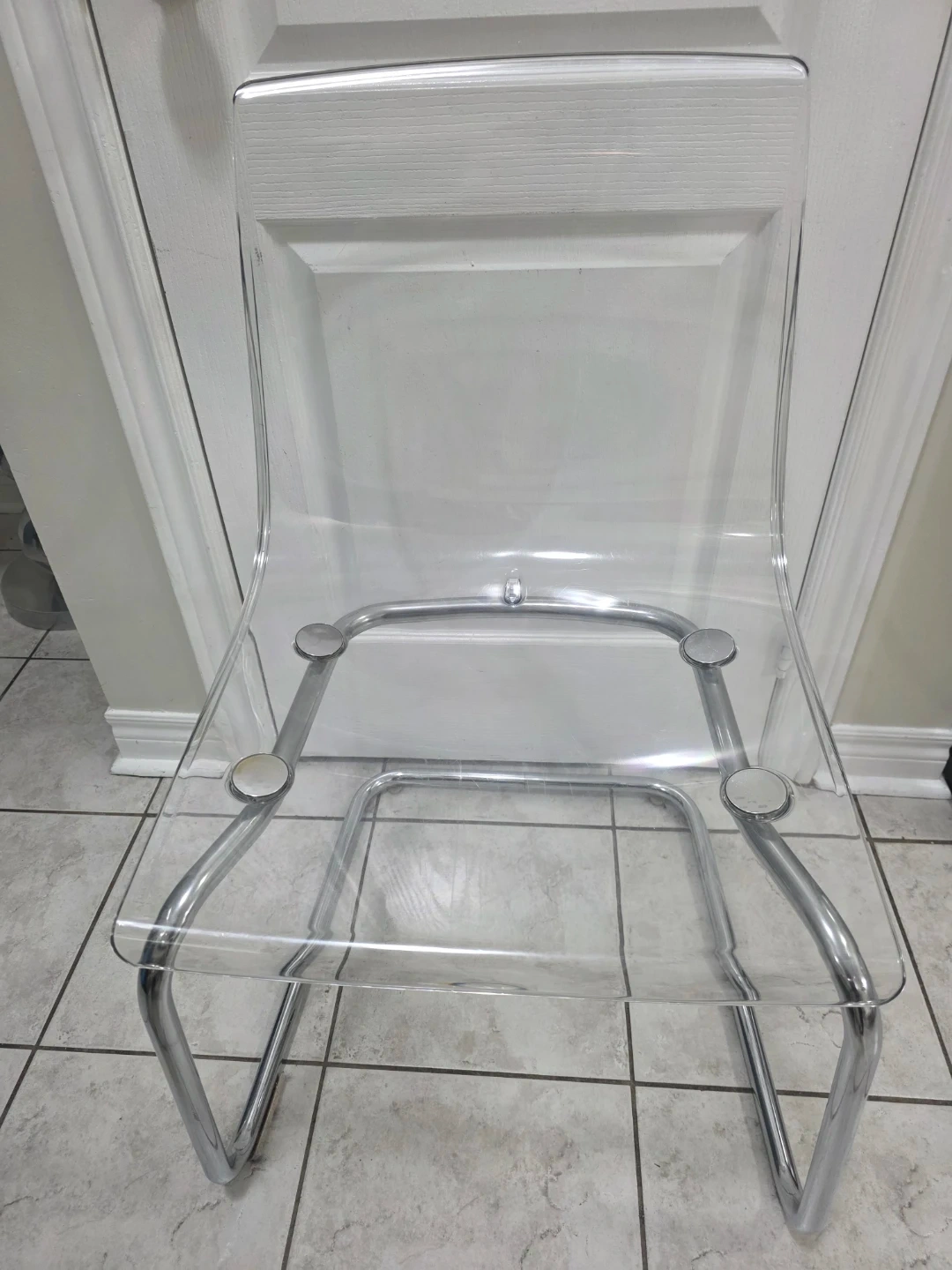 Selling 4 clear acrylic dining chair with chrome legs from Ikea. In great condition and would look great in any modern dining room or kitchen. The chair also comes with a white faux fur seat cushion.