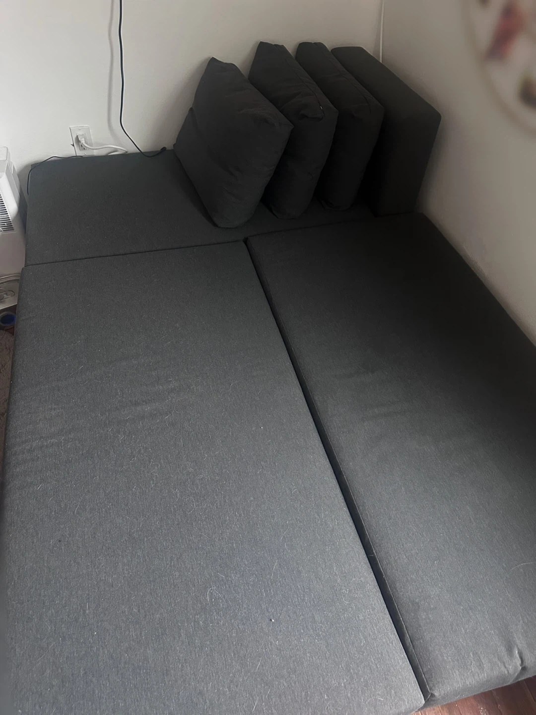 Selling a used Ikea Friheten sleeper sectional sofa in charcoal colour. It's in great shape and has a convenient storage compartment underneath the chaise. Perfect for small spaces or a guest room!