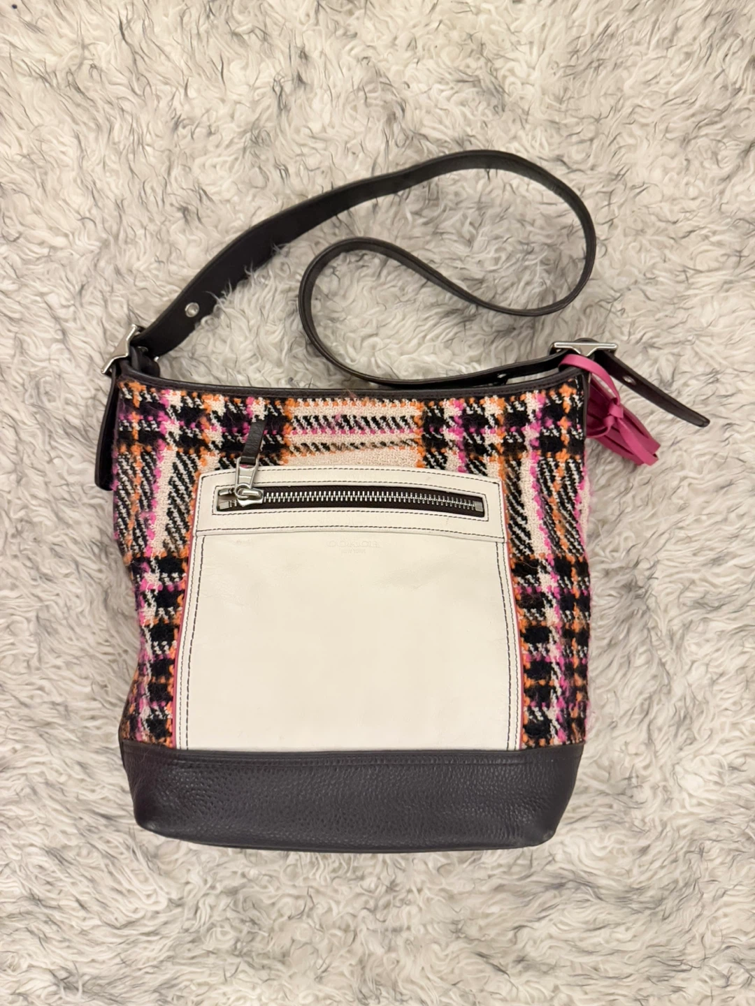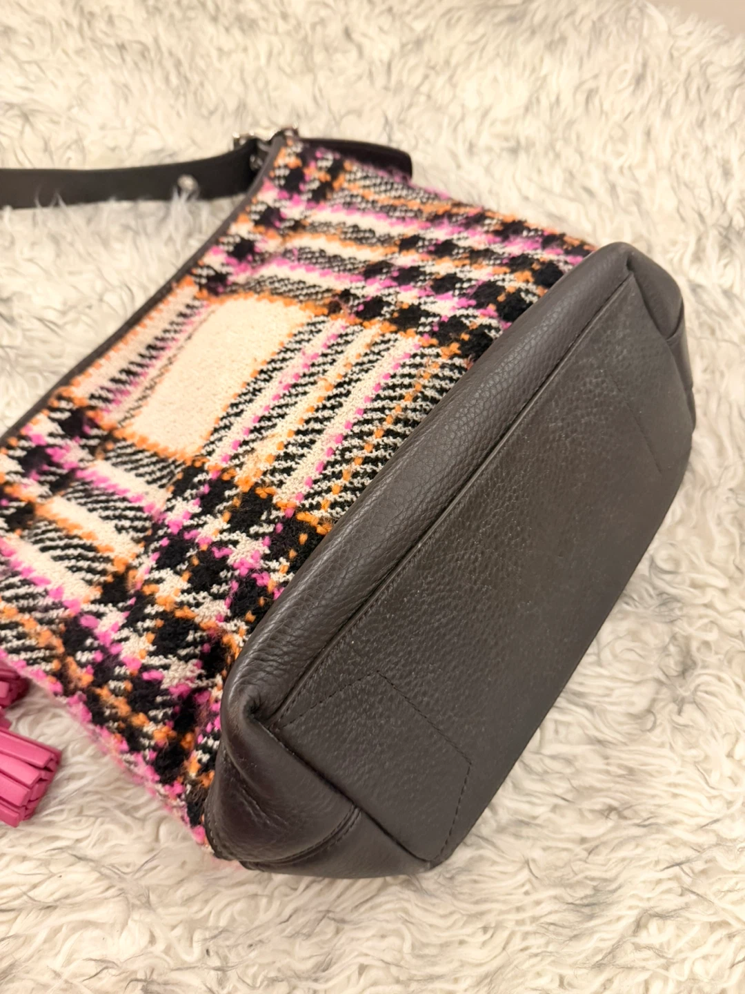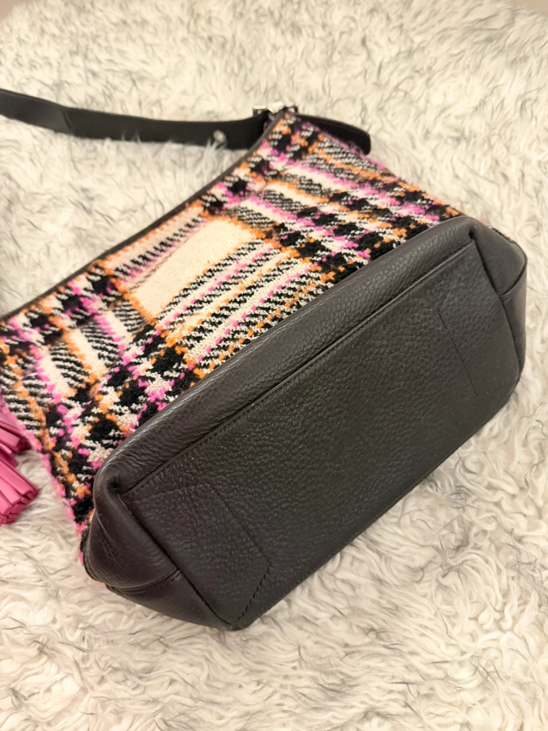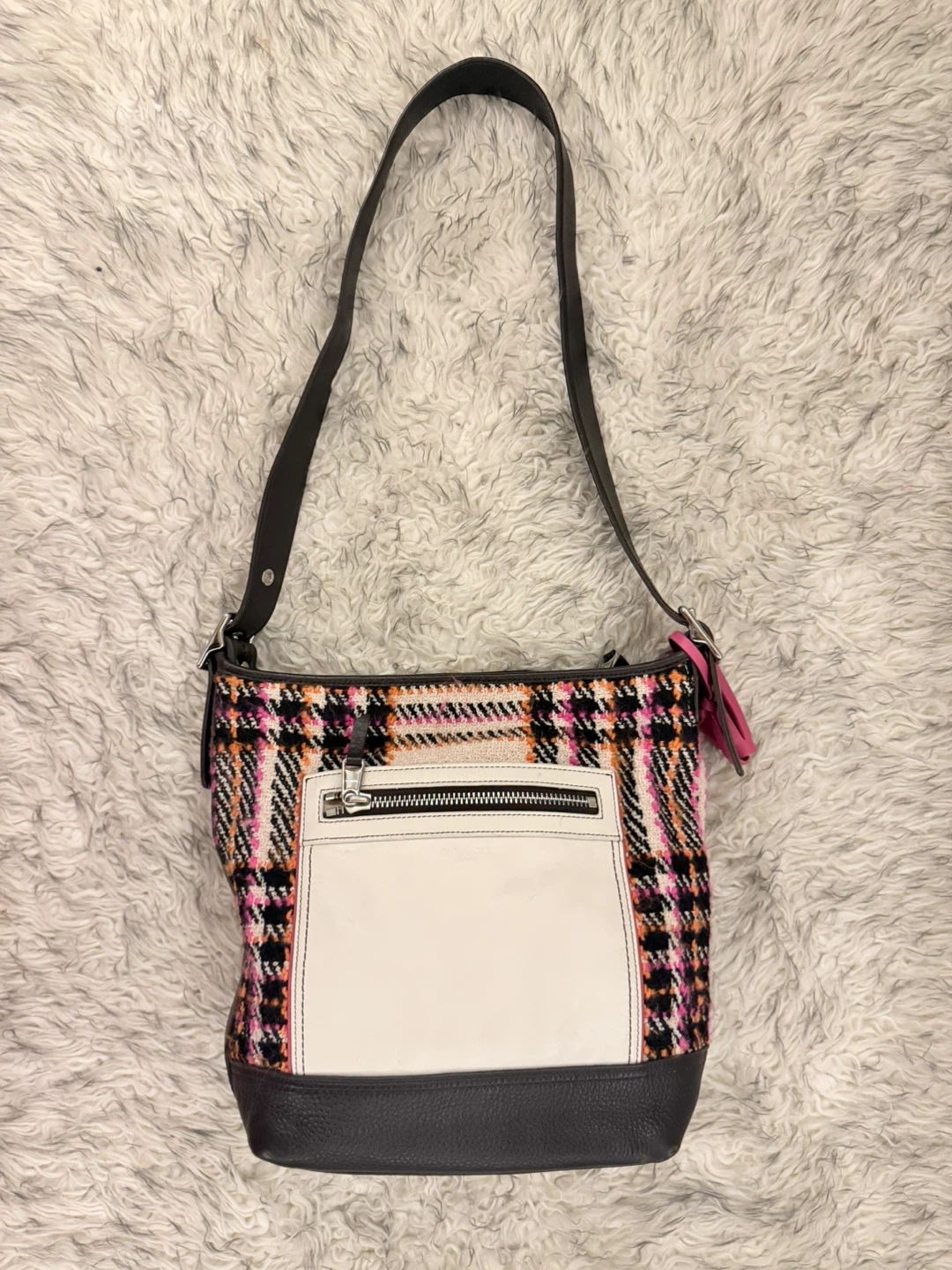 Multicolour plaid wool and leather. Too zipper closure. Silver toned hardware. Buckle style straps. Can be worn crossbody or shoulder.