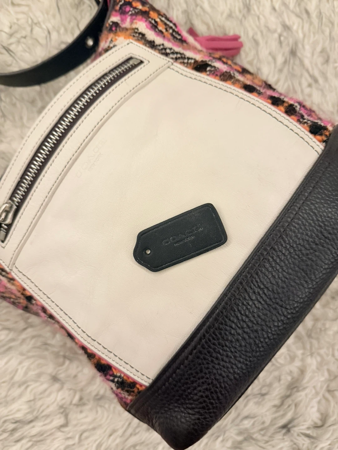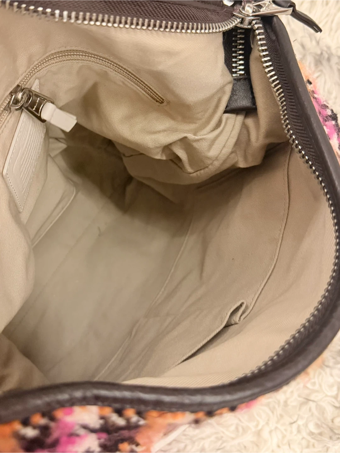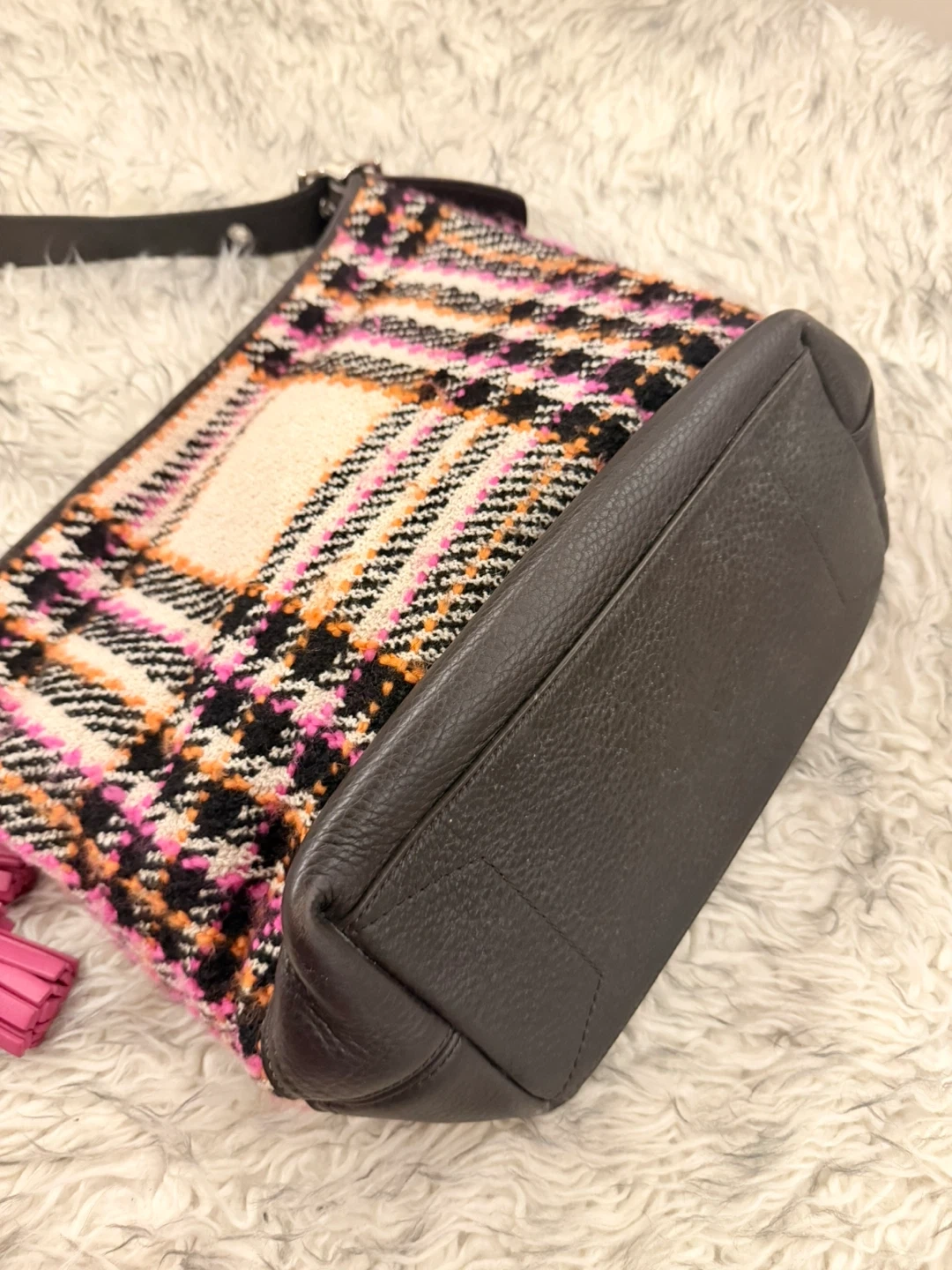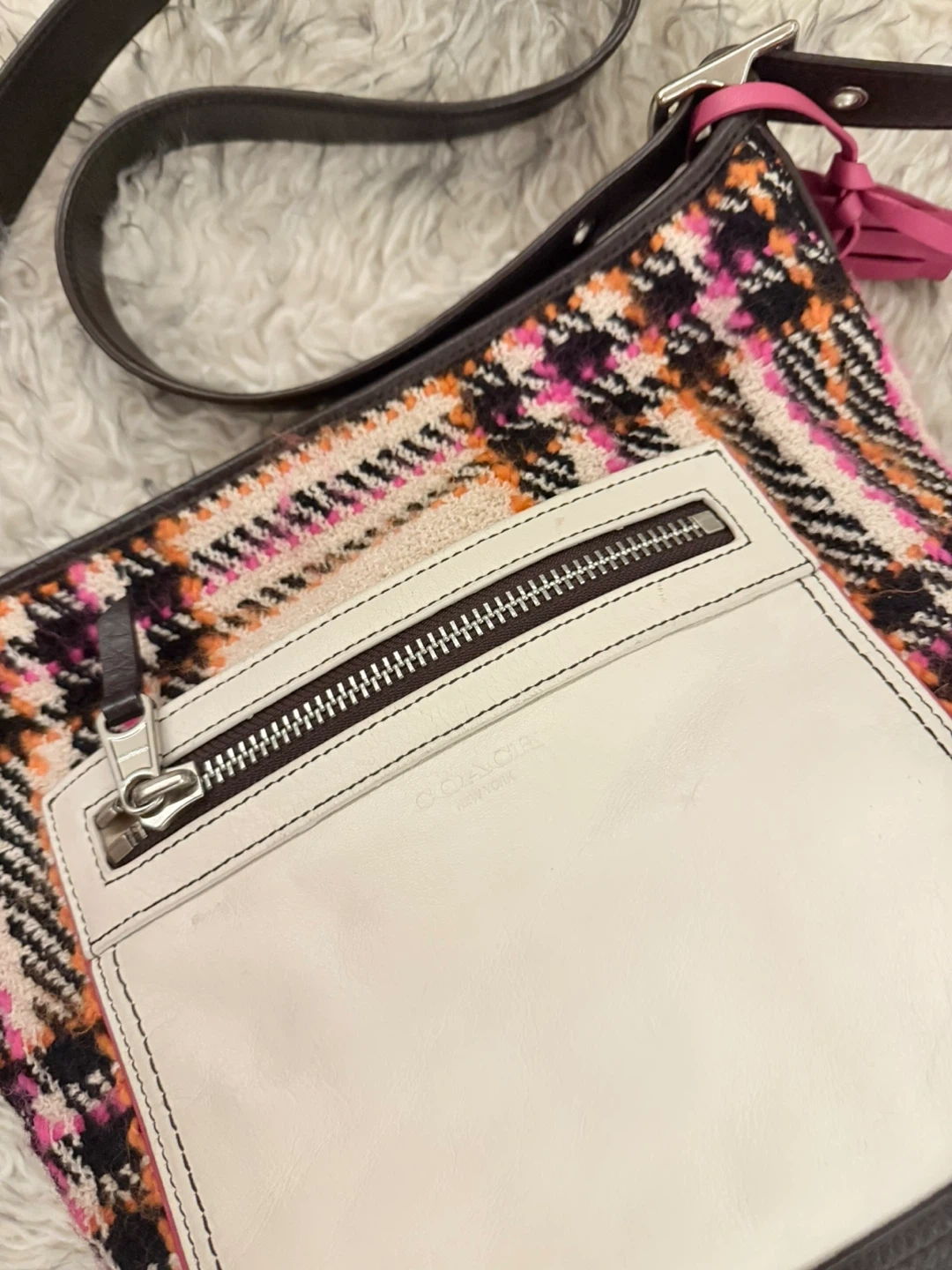Multicolour plaid wool and leather. Too zipper closure. Silver toned hardware. Buckle style straps. Can be worn crossbody or shoulder.